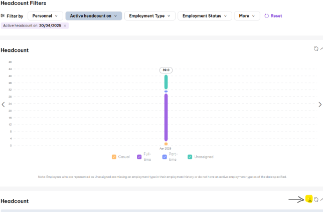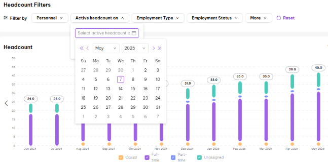 - Use the filters at the top to filter as needed. For example, click Active Headcount on and choose the EOM date required to get the headcount for a particular month.