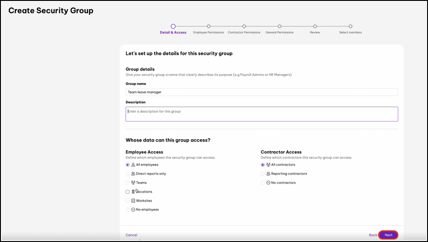 For detailed instructions on creating and managing Custom Security Groups, see Grant feature access to employees through Permission settings.