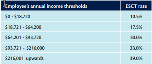 If an employee is a member of KiwiSaver, the employer must pay a minimum contribution of 3% of the employee’s gross earnings. This will increase to 3.5% as from April 1st 2026. This employer’s contribution is subject to the employer superannuation contribution tax aka ESCT.