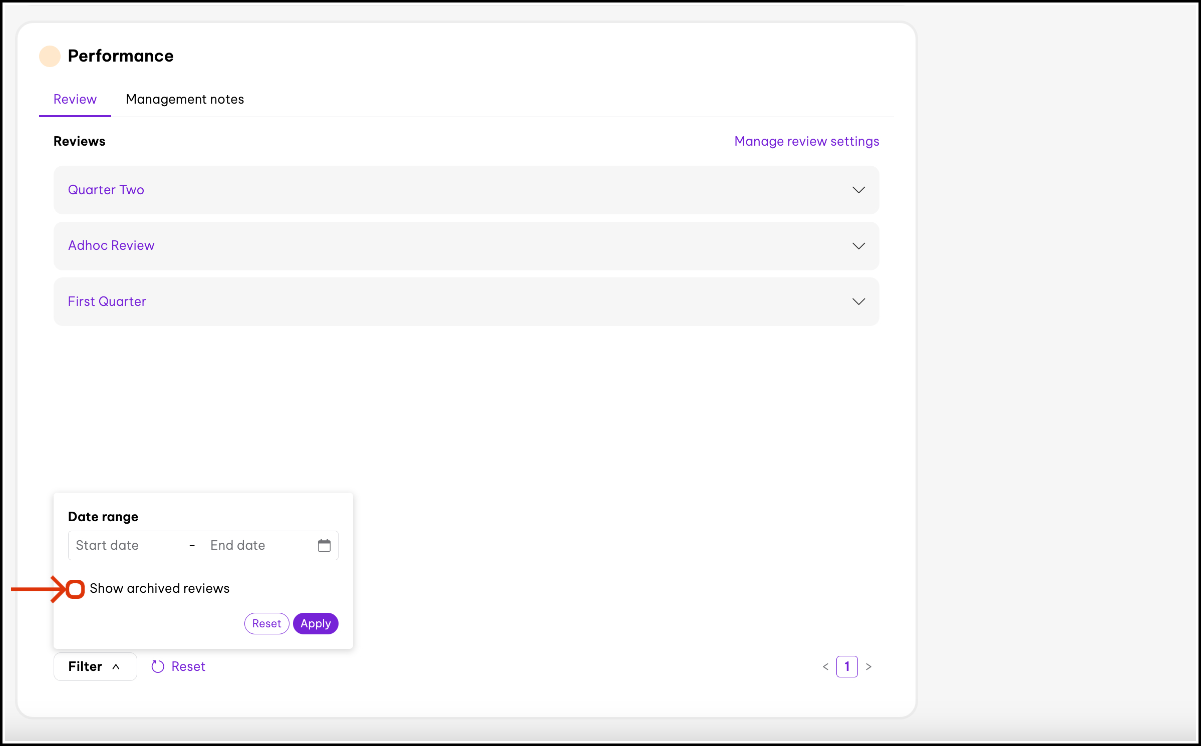 Management notes provide a flexible option for adding text-based notes to an employee's file. This feature also enables you to edit or delete these notes as needed. While the Performance Review feature displays specific details of an employee's performance review, such as completion state, progress status, and start and end dates. A Filter feature is also available, enabling you to customise the visibility of reviews based on specific time periods.