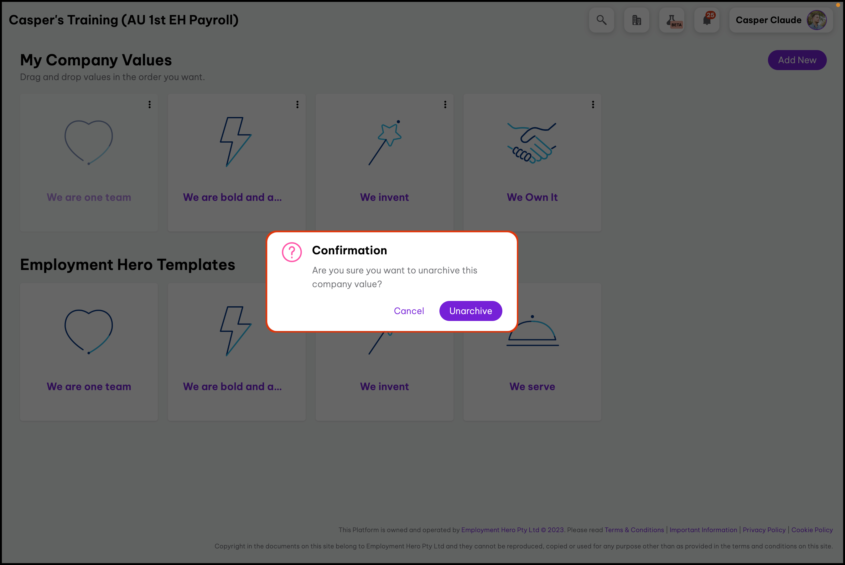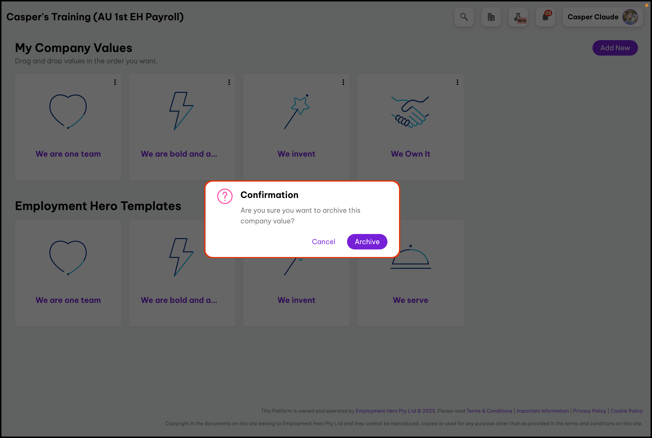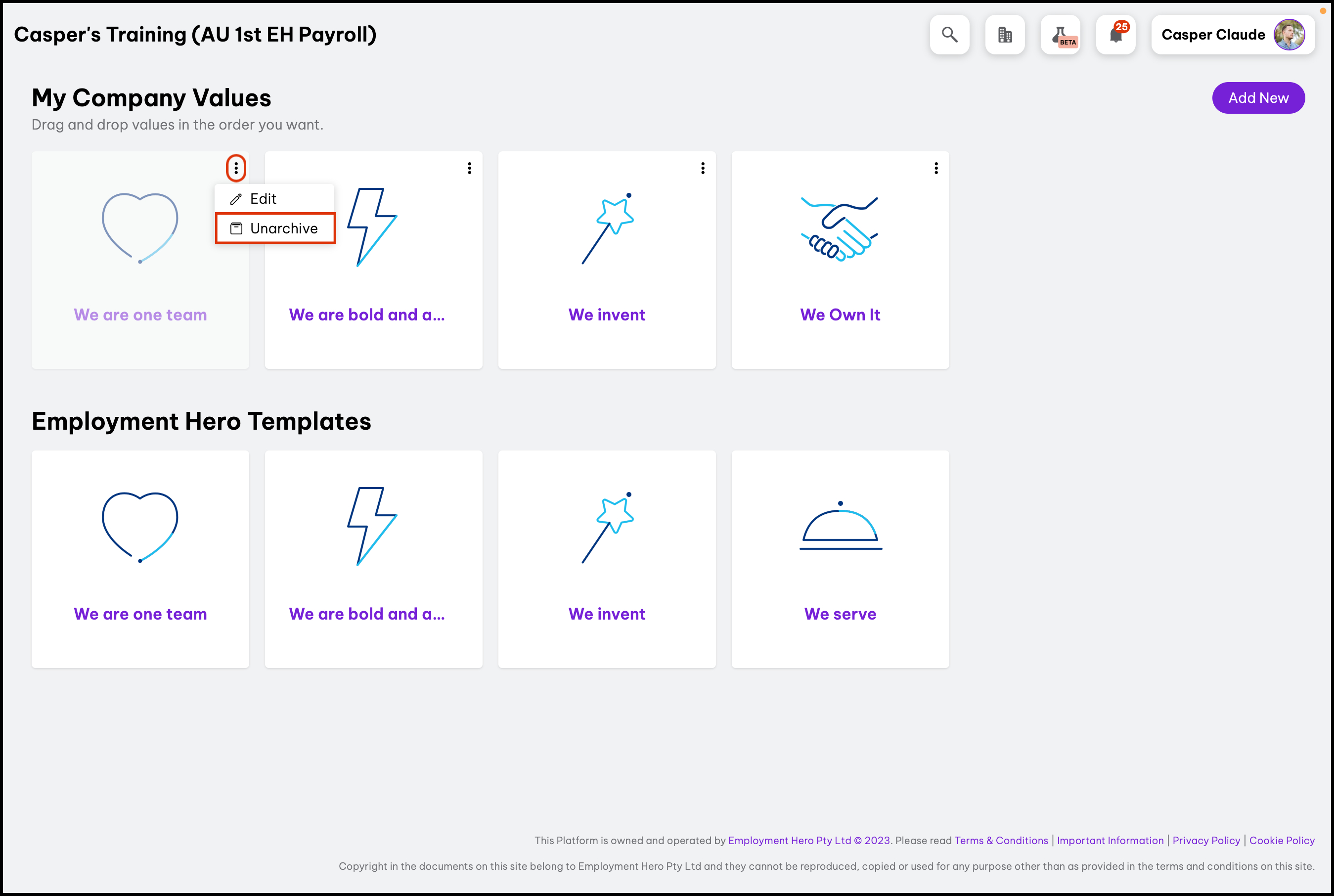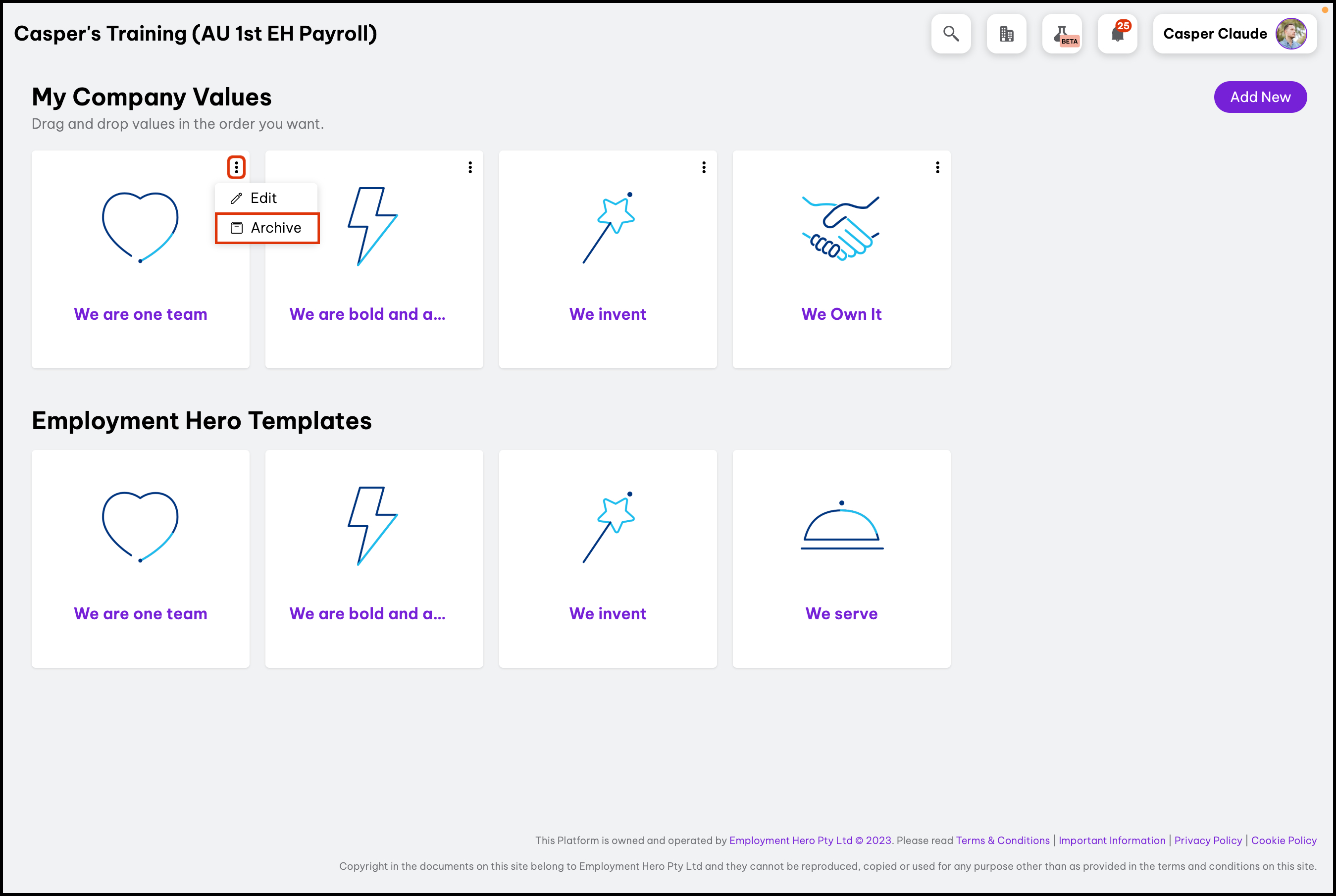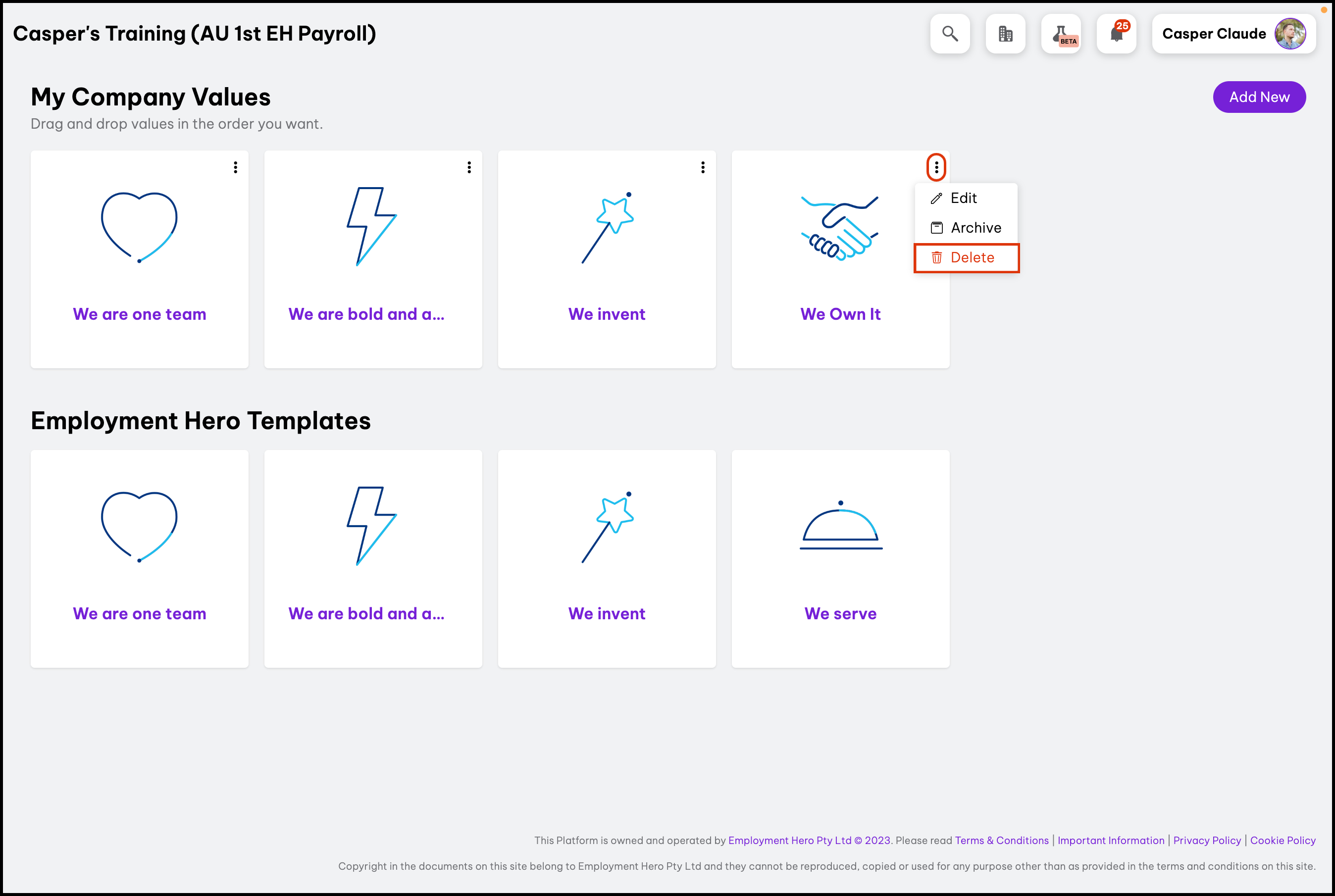 The Company Value Settings feature enables you to create your company values from scratch or by using our provided templates as a foundation. Additionally, this feature allows you to modify details, archive values you no longer use, or delete incorrectly added entries. Your employees can view the company values you created in the following feature.
