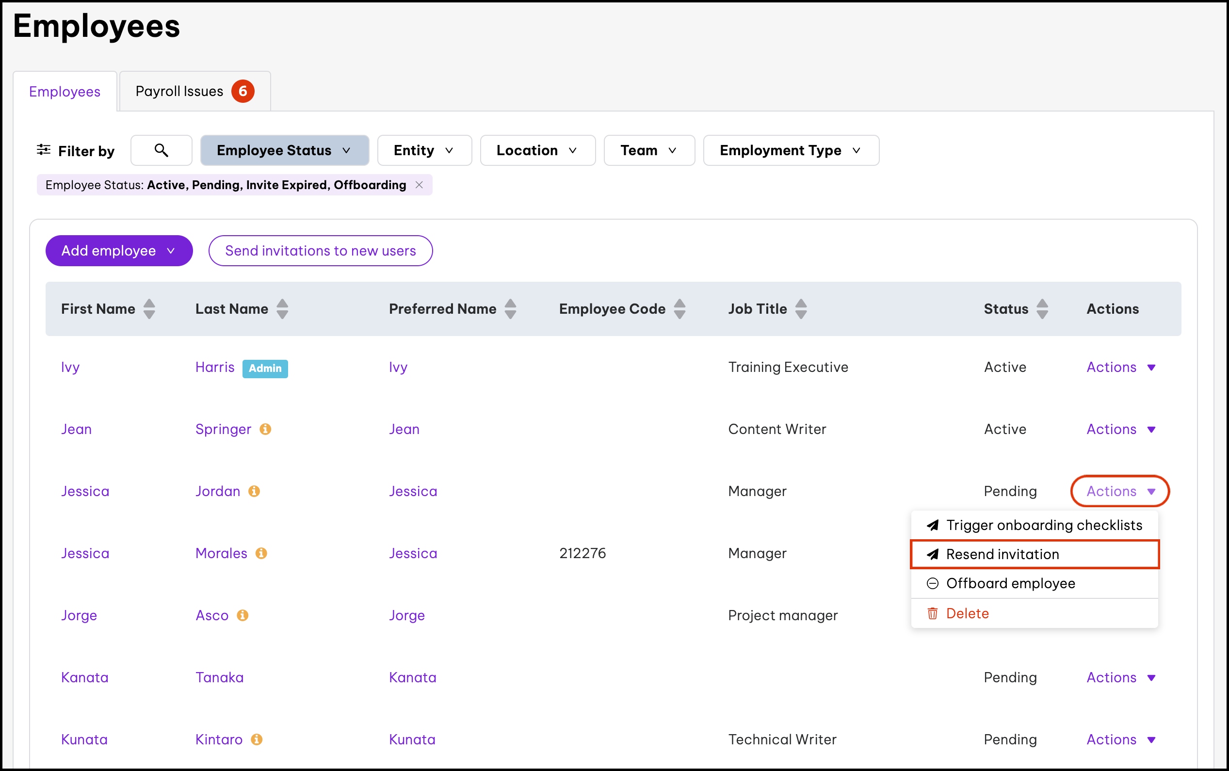 To replace an employee's Invite Expired status with the Pending status, resend the invite to the employee..