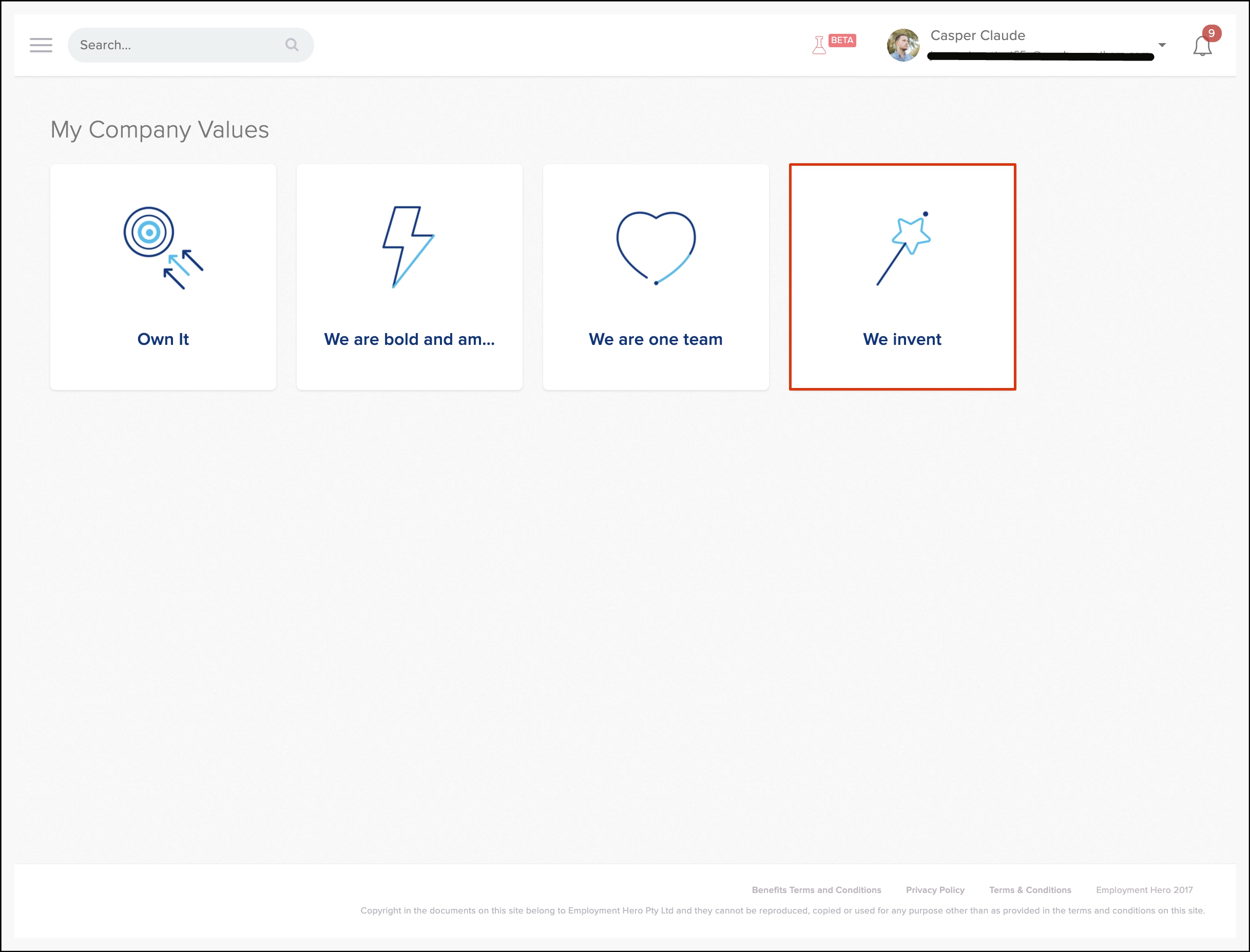 The Company Values feature allows you to view the details about each of your organisation's chosen company values. Enabling you to see the what your leadership team feels embodies the vision and purpose of your business.