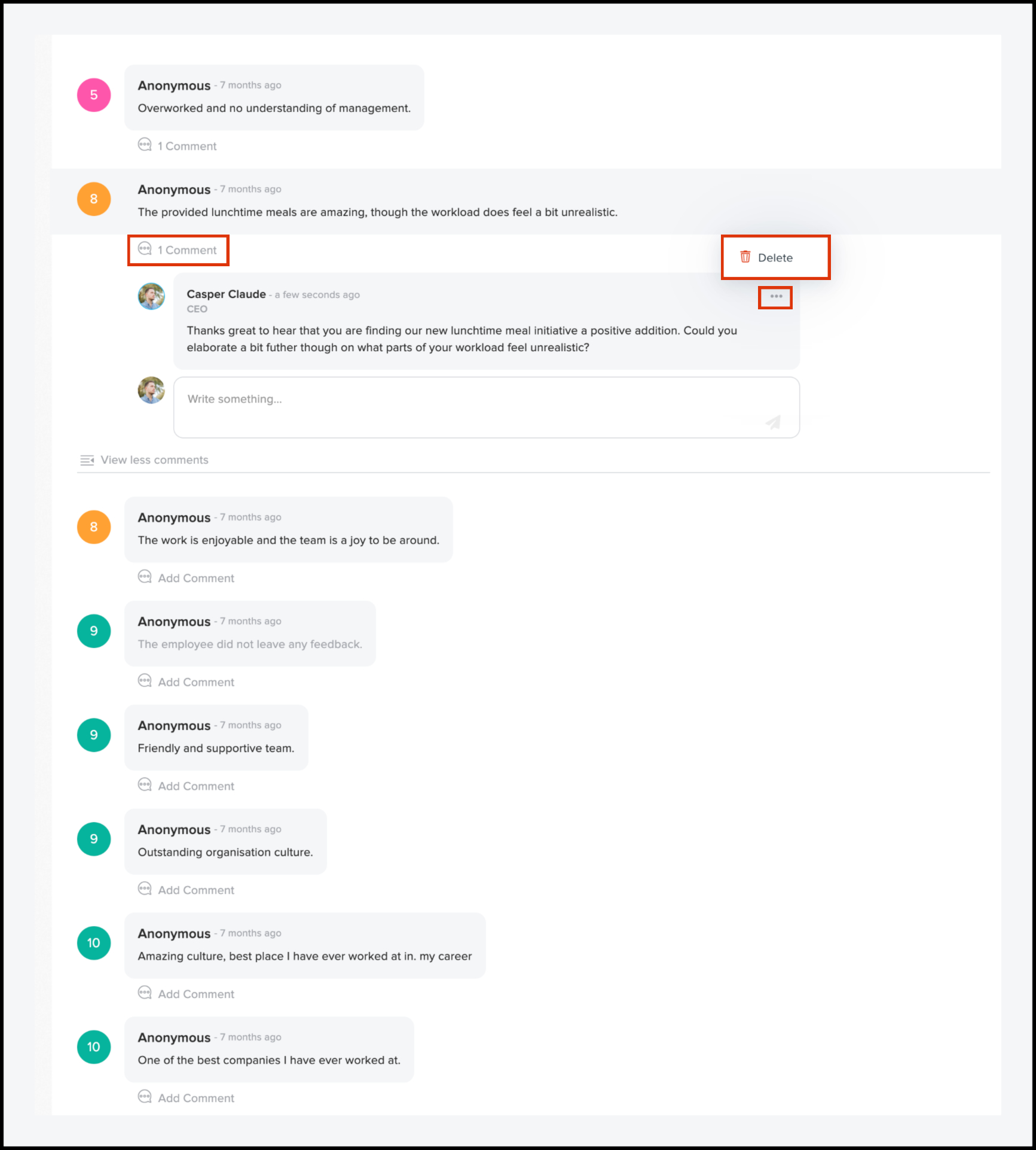 The ability to add a comment to an anonymous response is only available on our platinum pricing tier. You can comment on an employee survey even if they have not provided a comment and have only offered a happiness score.