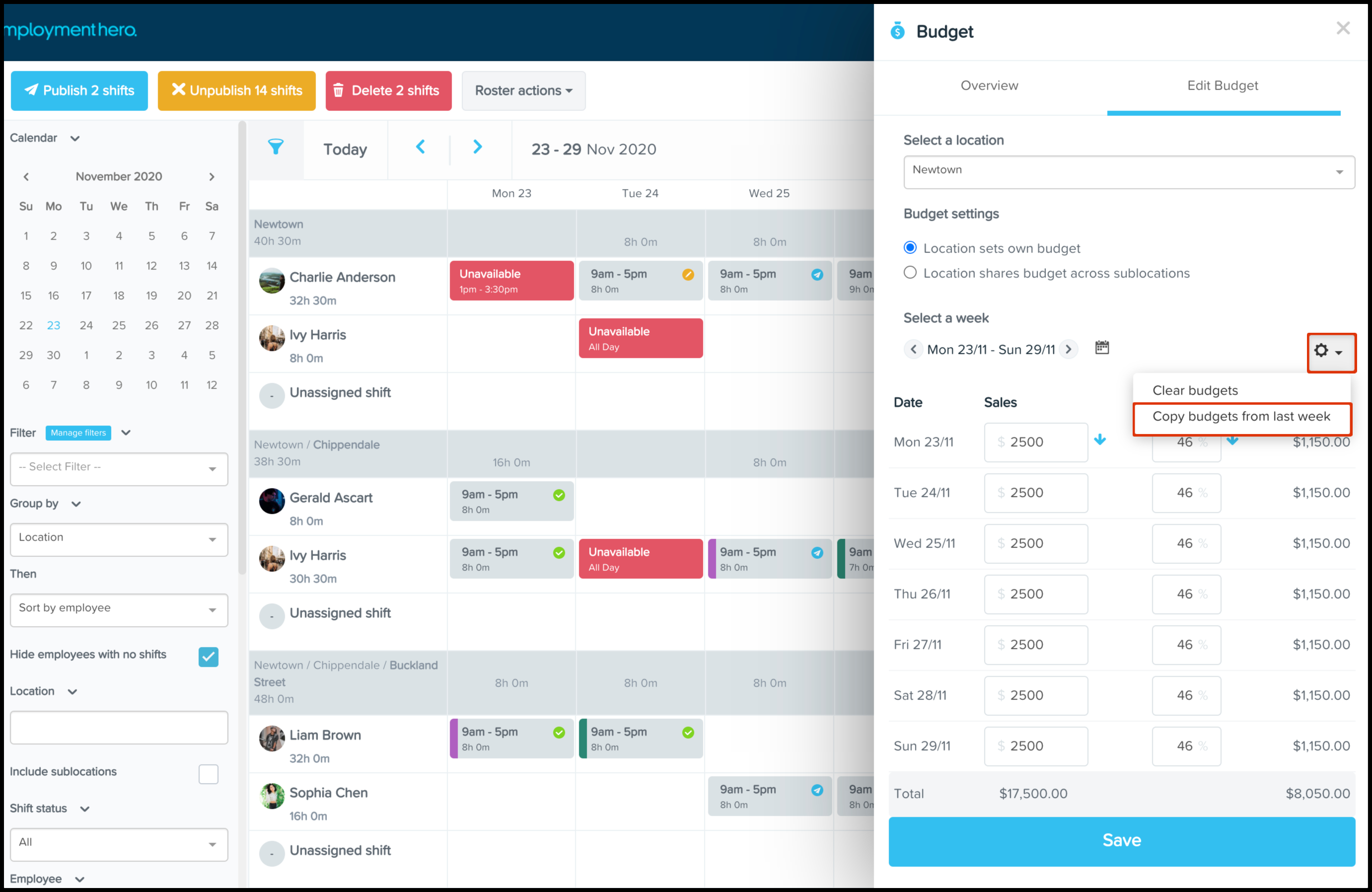 - Once you have set your budget, you can view the shift costs vs budget by clicking on the header of any location