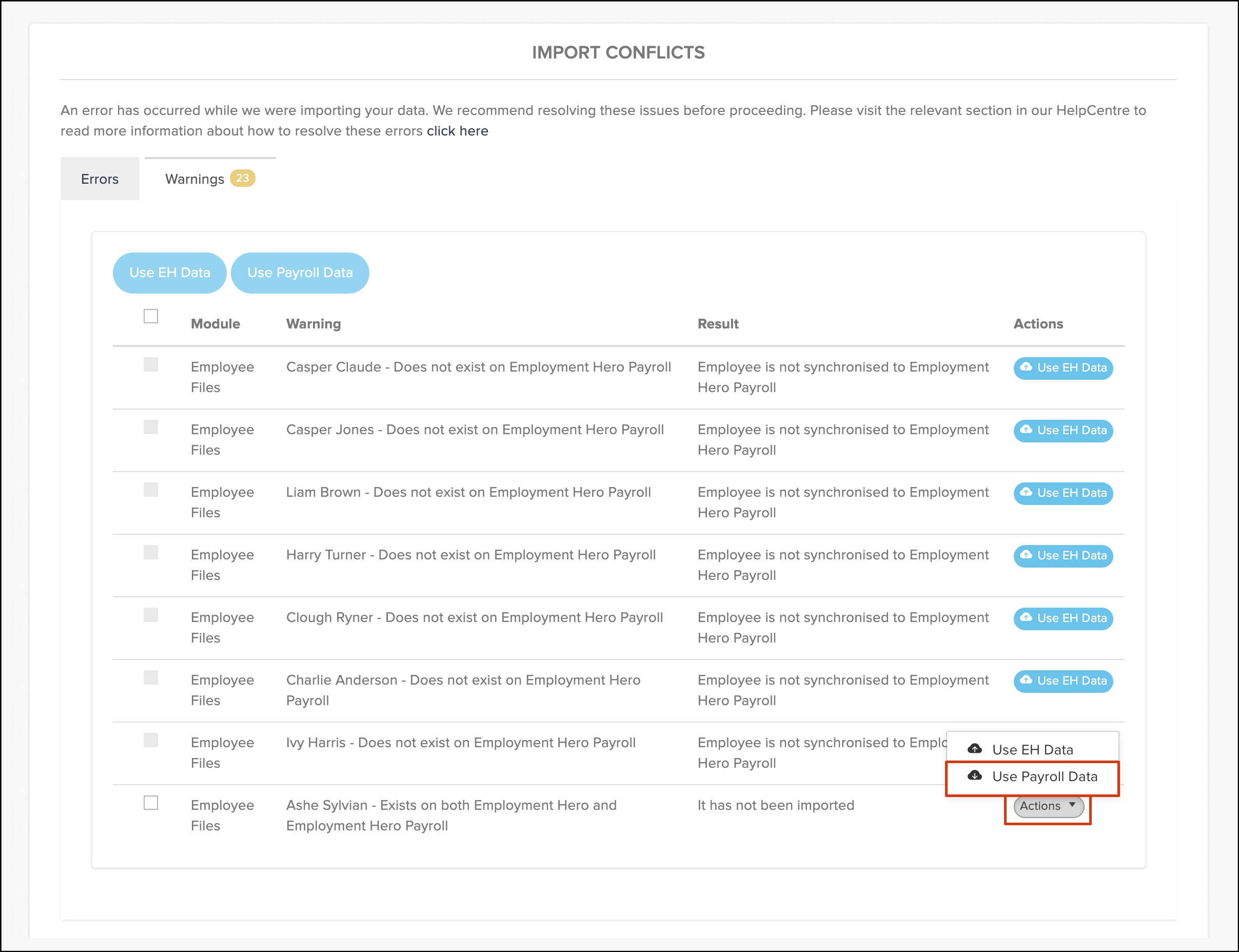 | Import conflict. | Employee File. | Employee exists on both Employment Hero HR and Employment Hero payroll classic. |