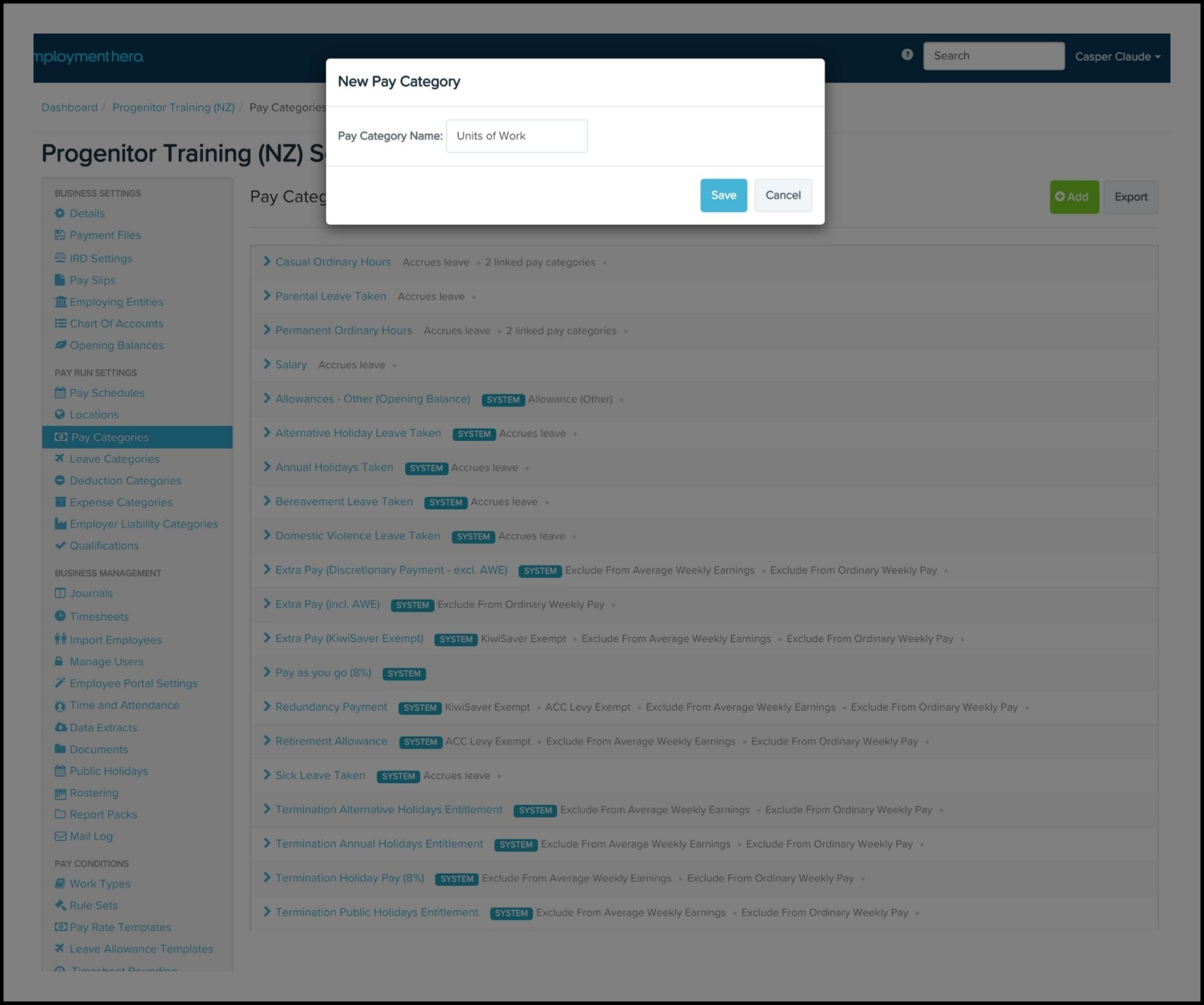 - Enter the pay category name and click the Save button.
