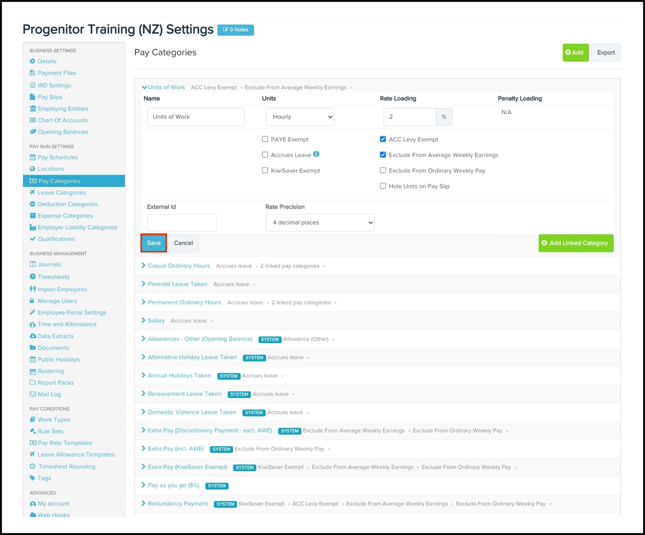 You can click the Add Linked Category button to link pay categories together. When linking a pay category to a base pay category, you only need to specify the base rate for the employee and it will automatically calculate the rate for the linked pay categories.