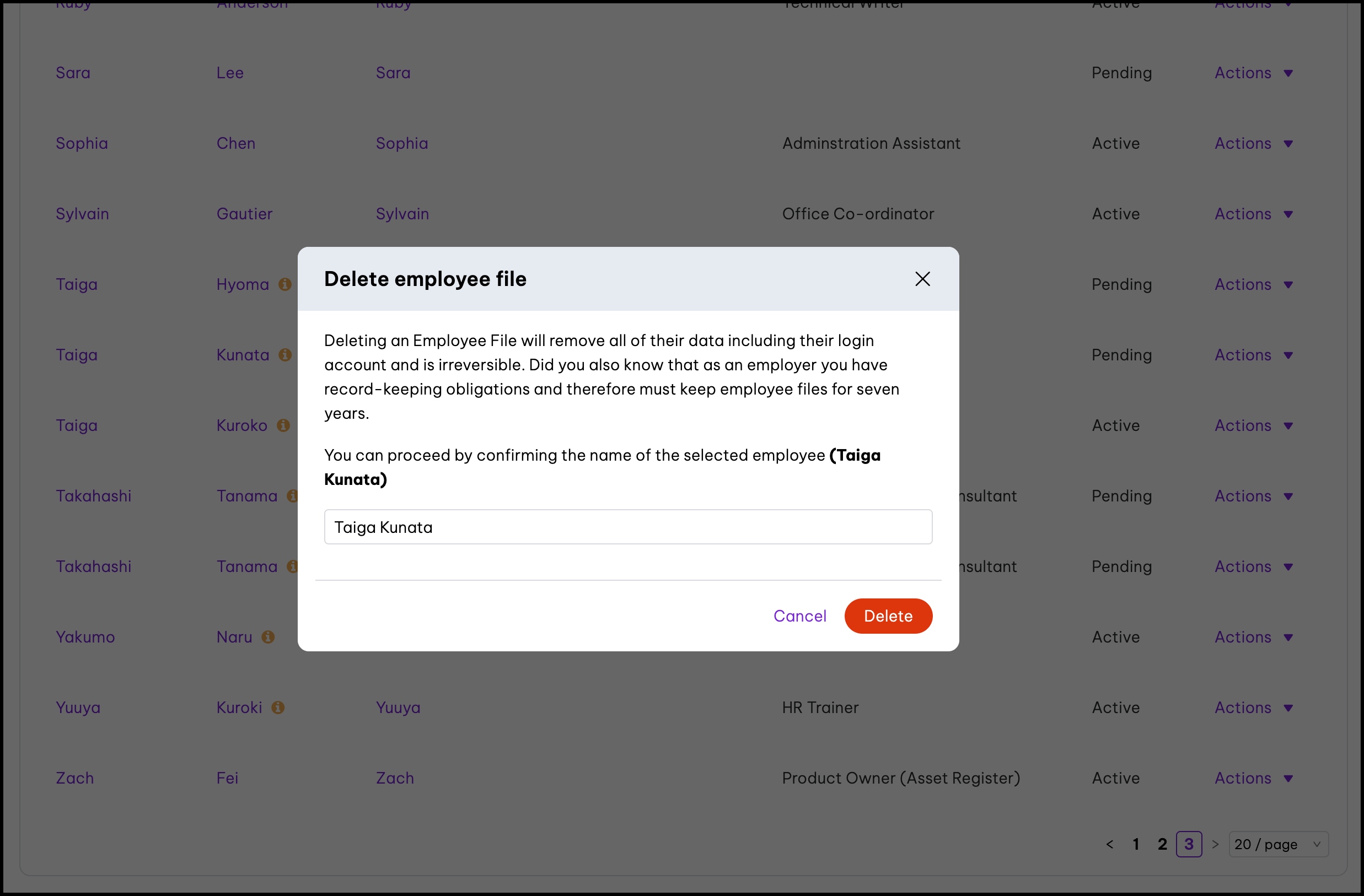 Employment Hero shows the employee's name in bold within the two brackets. The employee's name, however, does not include the two outer brackets. To delete an employee, you need to type in the employee's name, including any dates, times and/or punctuation marks displayed in the name.