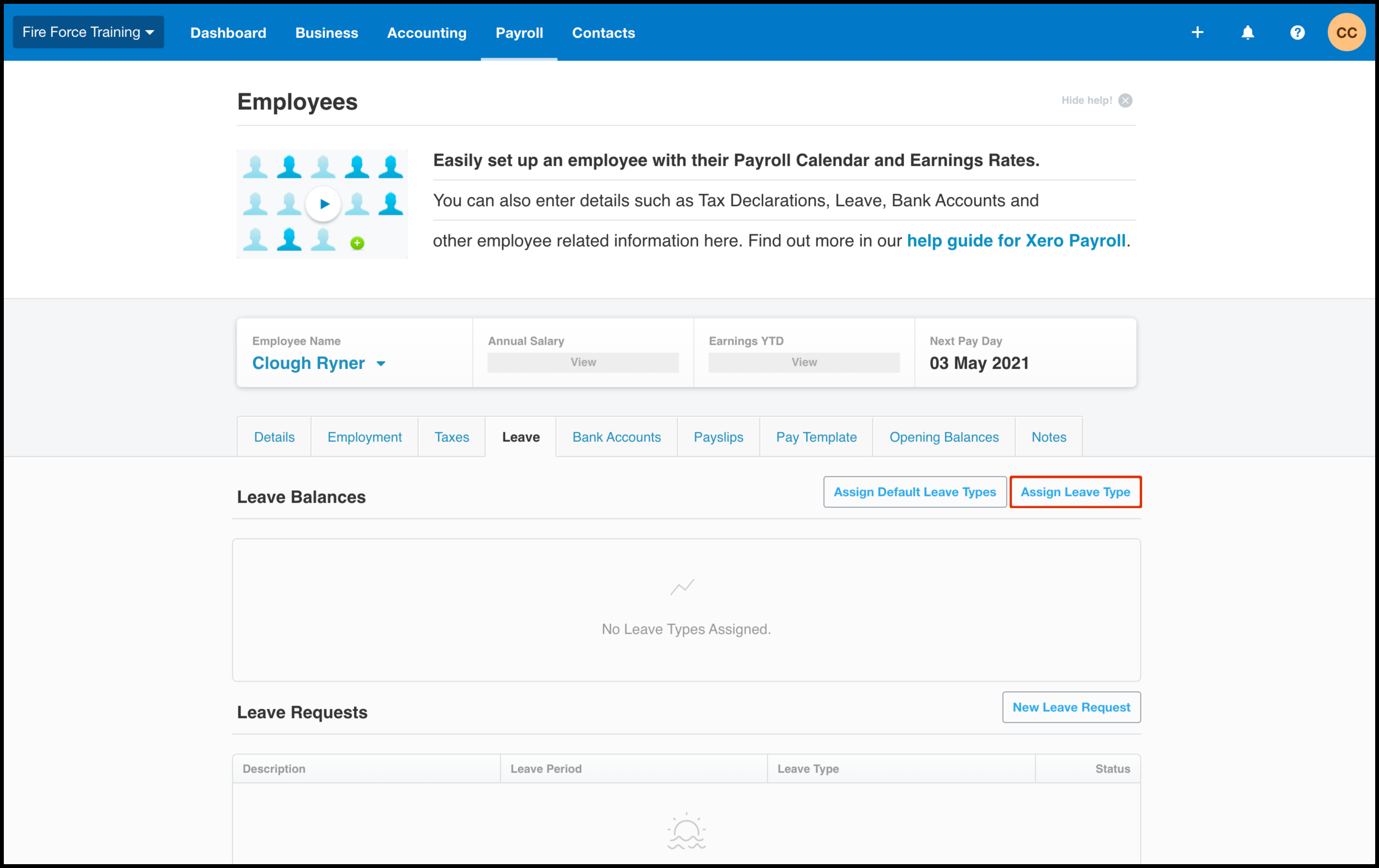 - Click on employee that needs a leave type assigned.