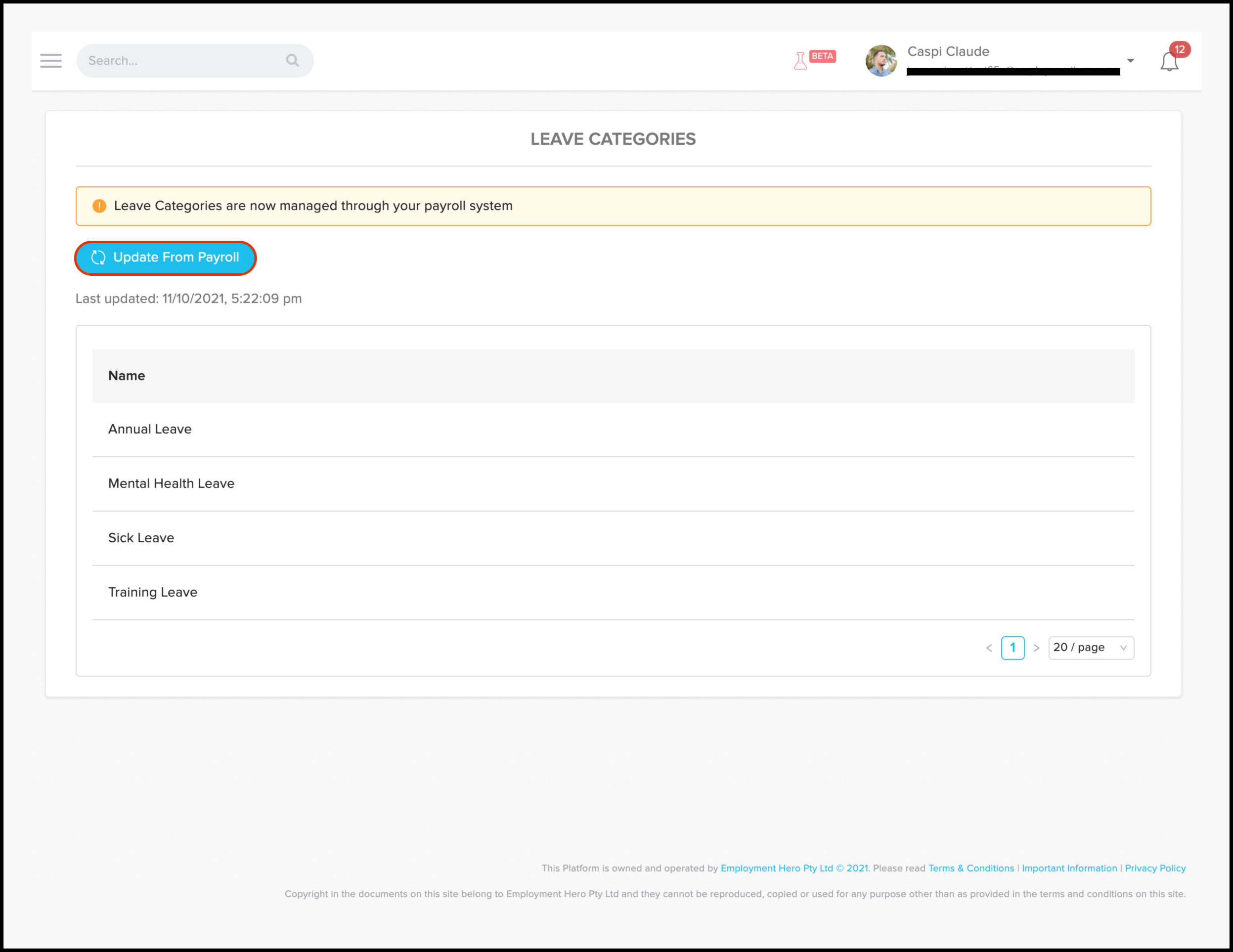 The Leave Categories page will now show a grey Updated button. This means Employment Hero has successfully imported your leave categories from your Xero platform.
