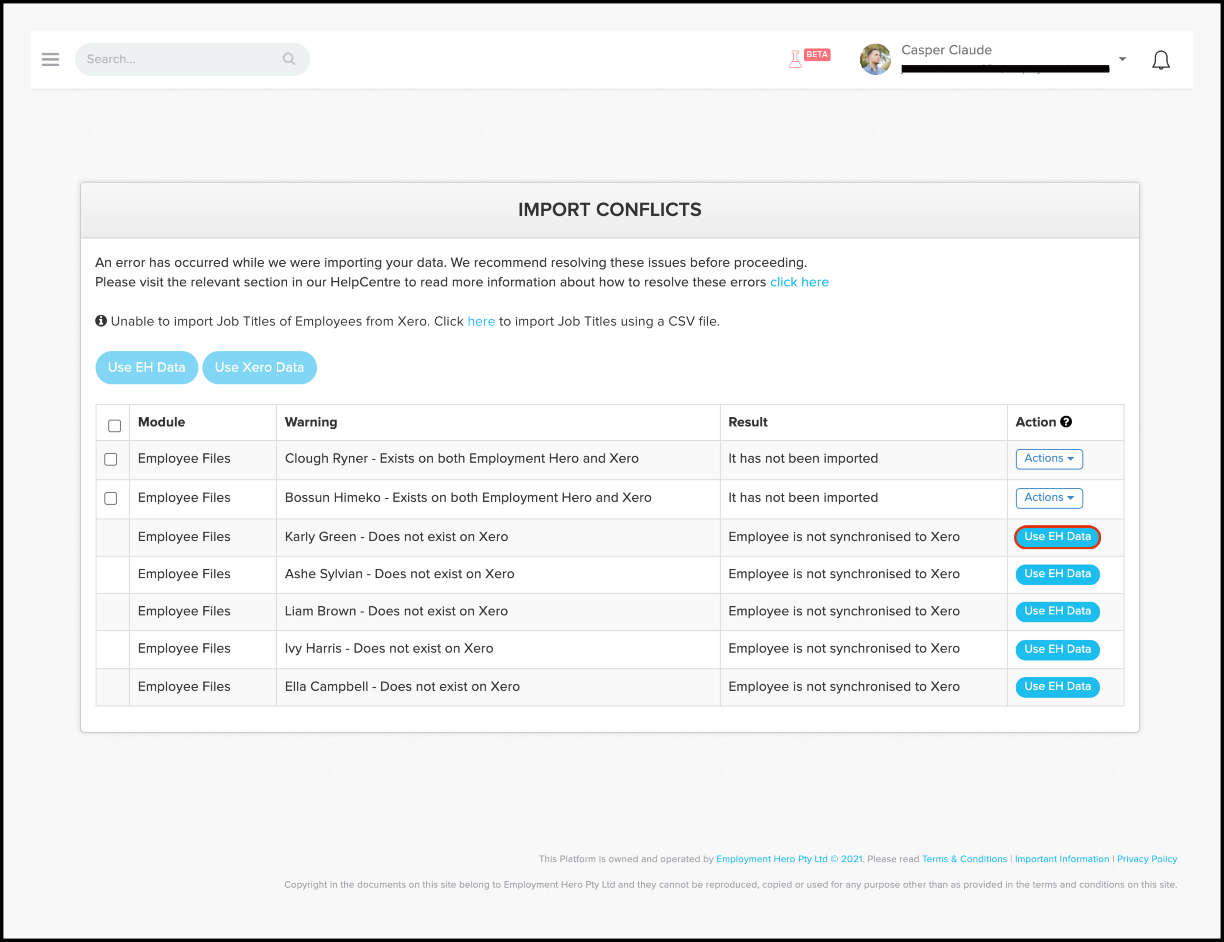 | Import conflict | Employee file | Employee does not exist on Xero |