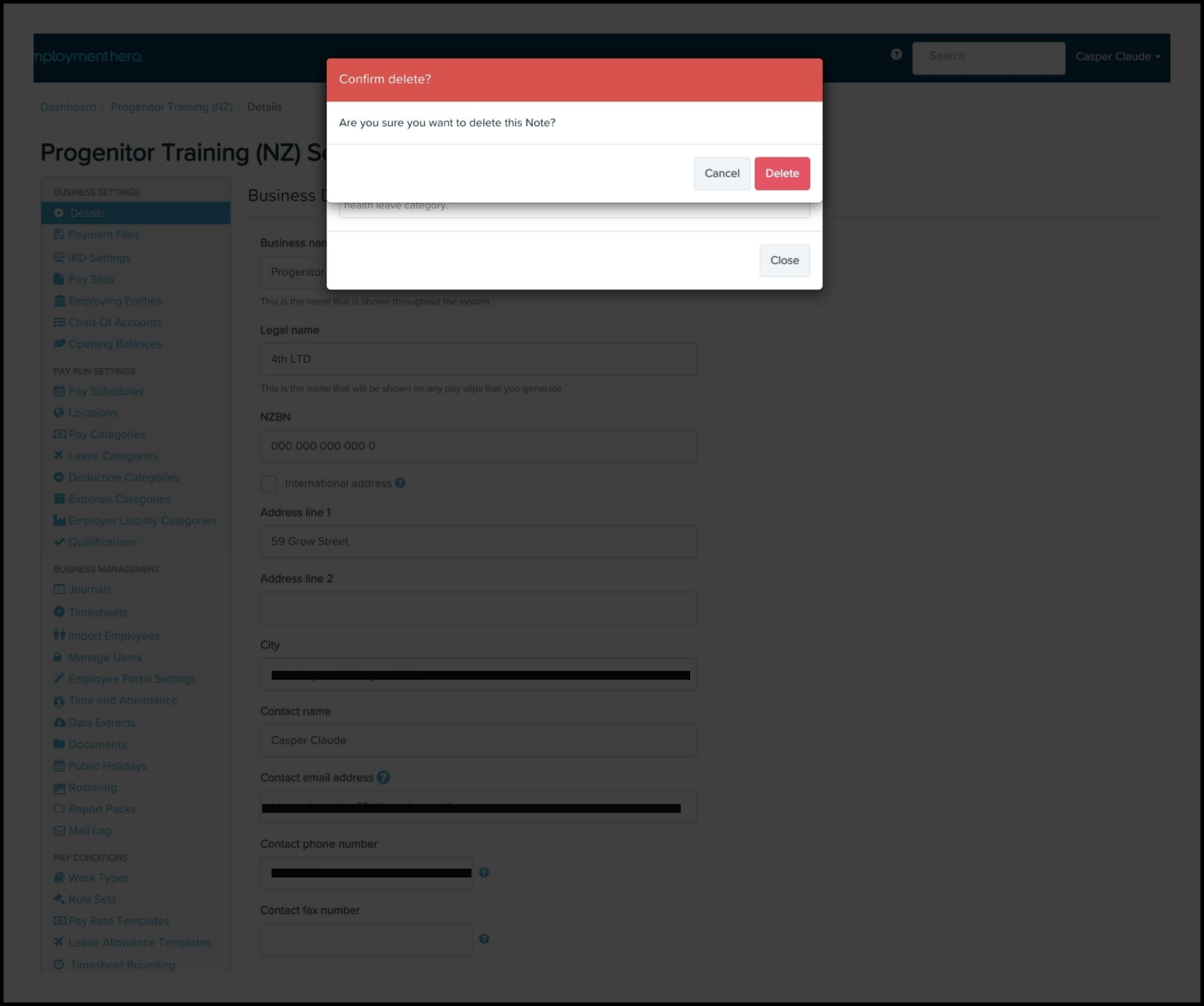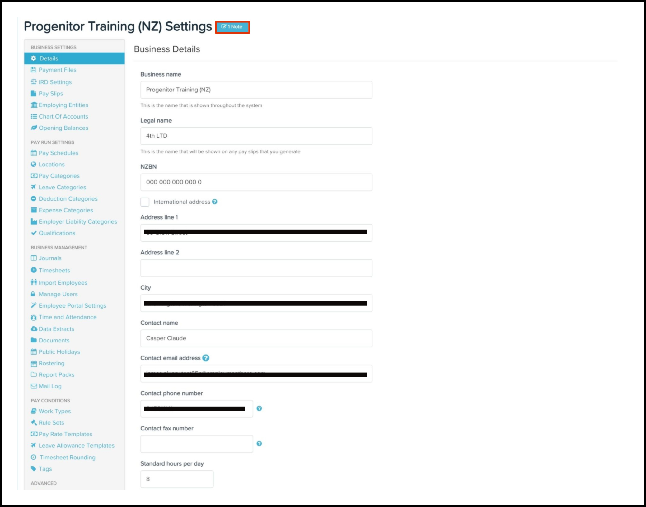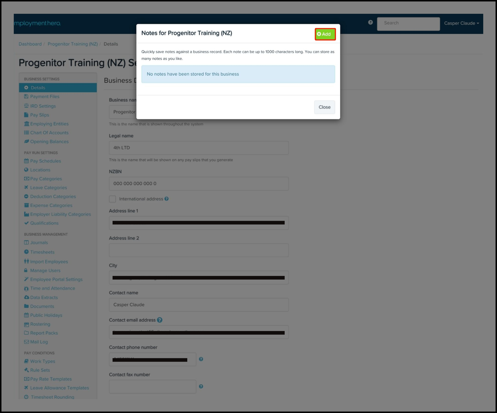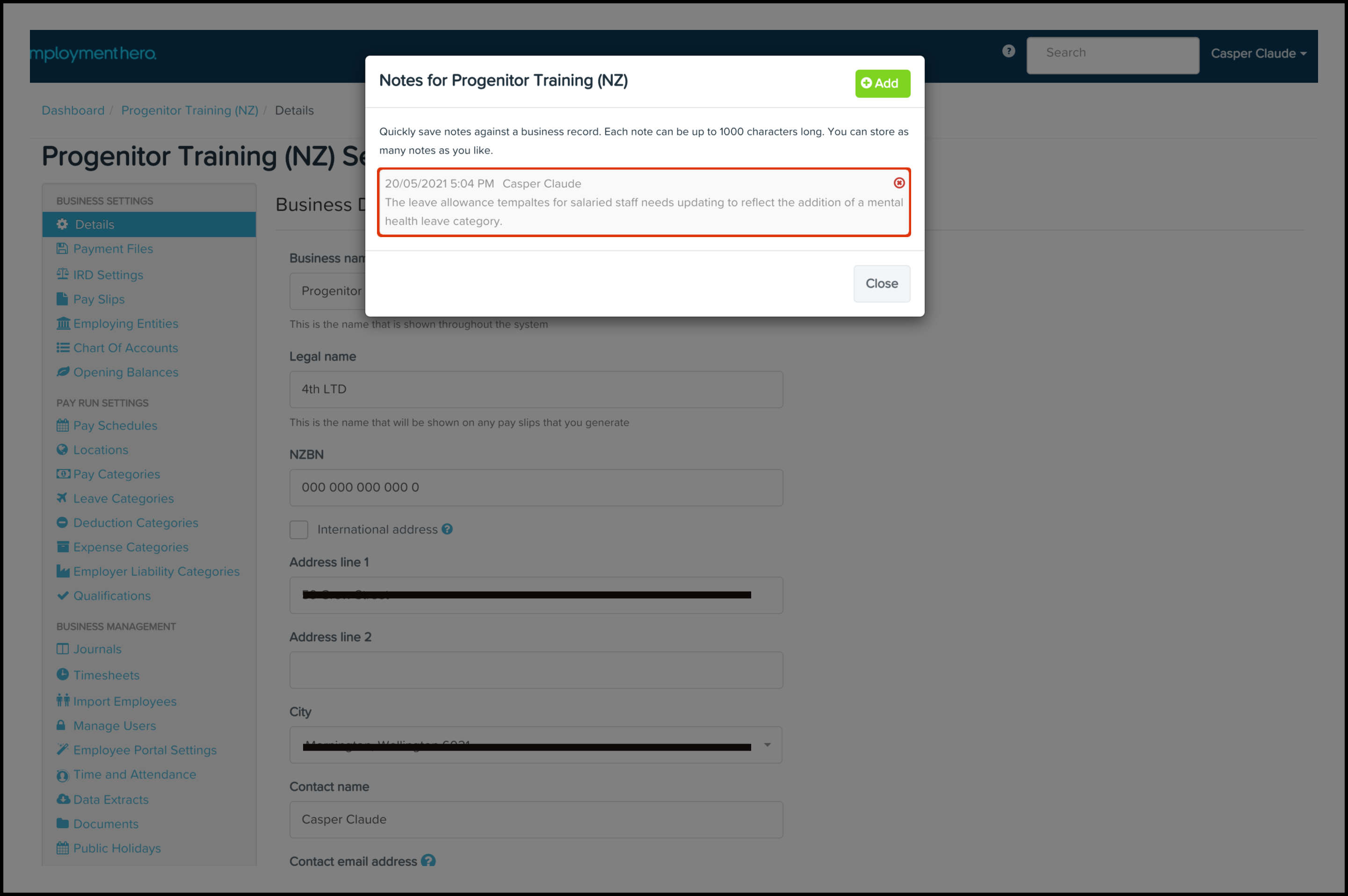 The Organisation File Notes feature allows you to write out a message and save it against your business organisation file. You can also use this feature to delete a note if it is no longer needed. For example, once you update your business leave allowance templates, you can then remove the attached organisational file note.