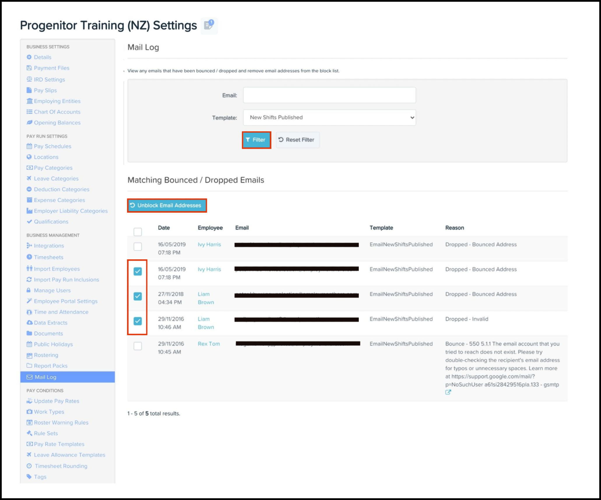 If an employee notifies you they have not received emails from the payroll platform, you can use the Mail Log feature to see if any emails have bounced and/or dropped. If there are emails that have bounced and/or dropped, there is an Unblock feature you can use to resend the email to the employee.
