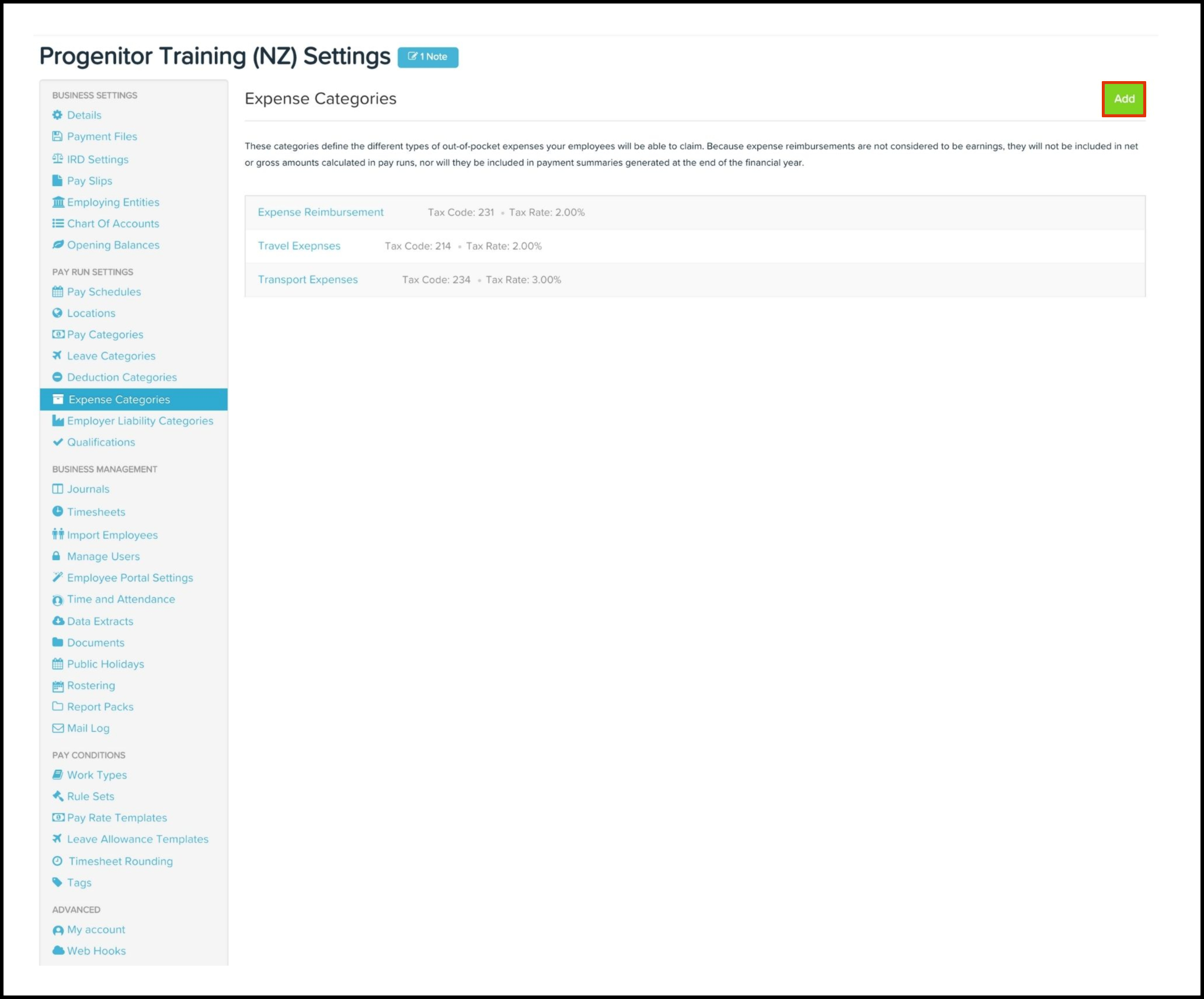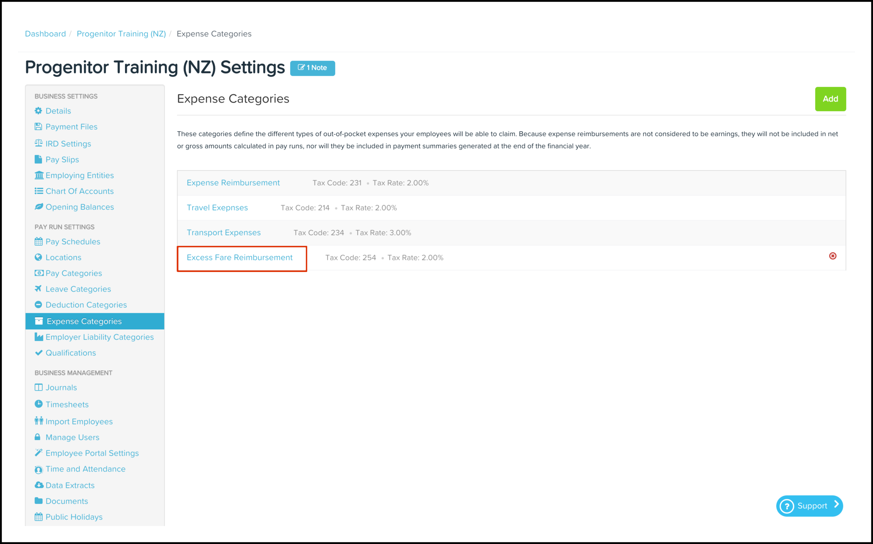 You can delete categories, as long as the data has no association with unfinalised pay runs, recurring employee expenses, or pending or approved employee expense requests. Refer to the Draft Pay Run Audit report if need to know the employees impacted by expense category in unfinalised pay run