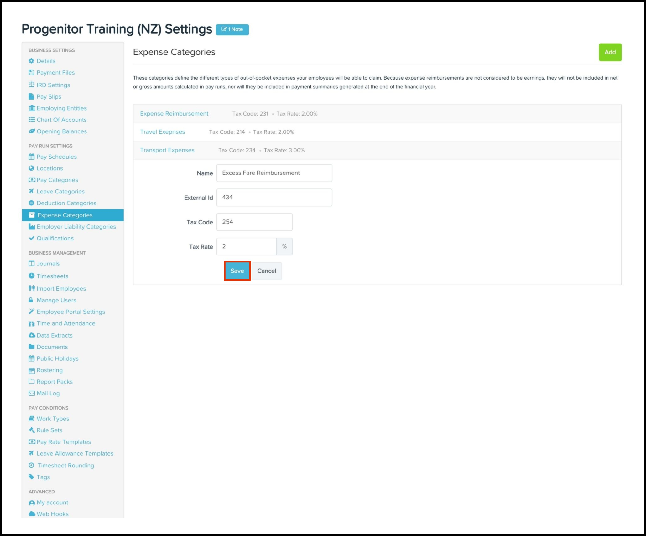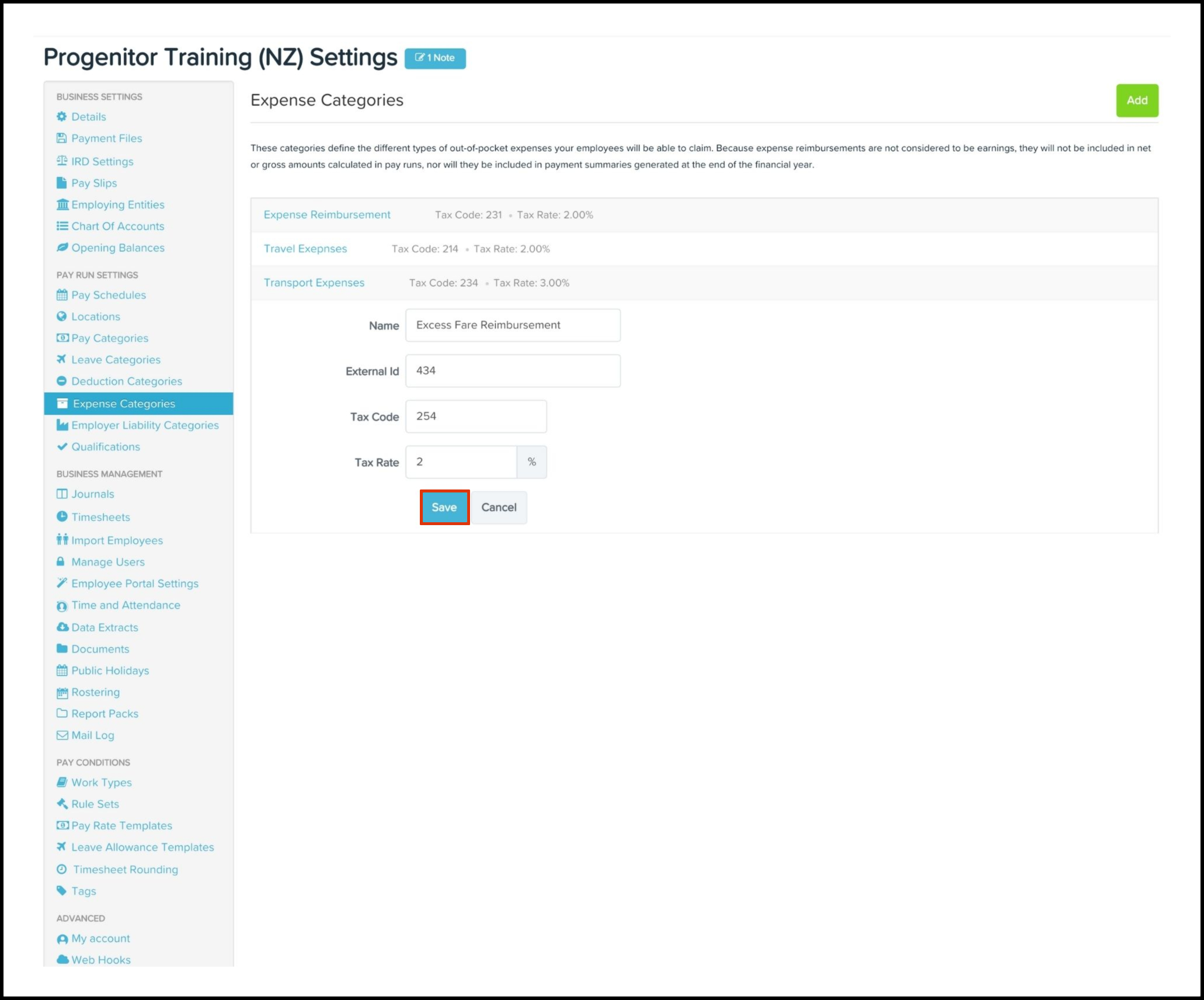 The Expense Category feature allows you to create a new expense category and include details such as the tax code, tax rate and external ID. You can also use this feature to edit the information if it changes and delete a record that is no longer required.