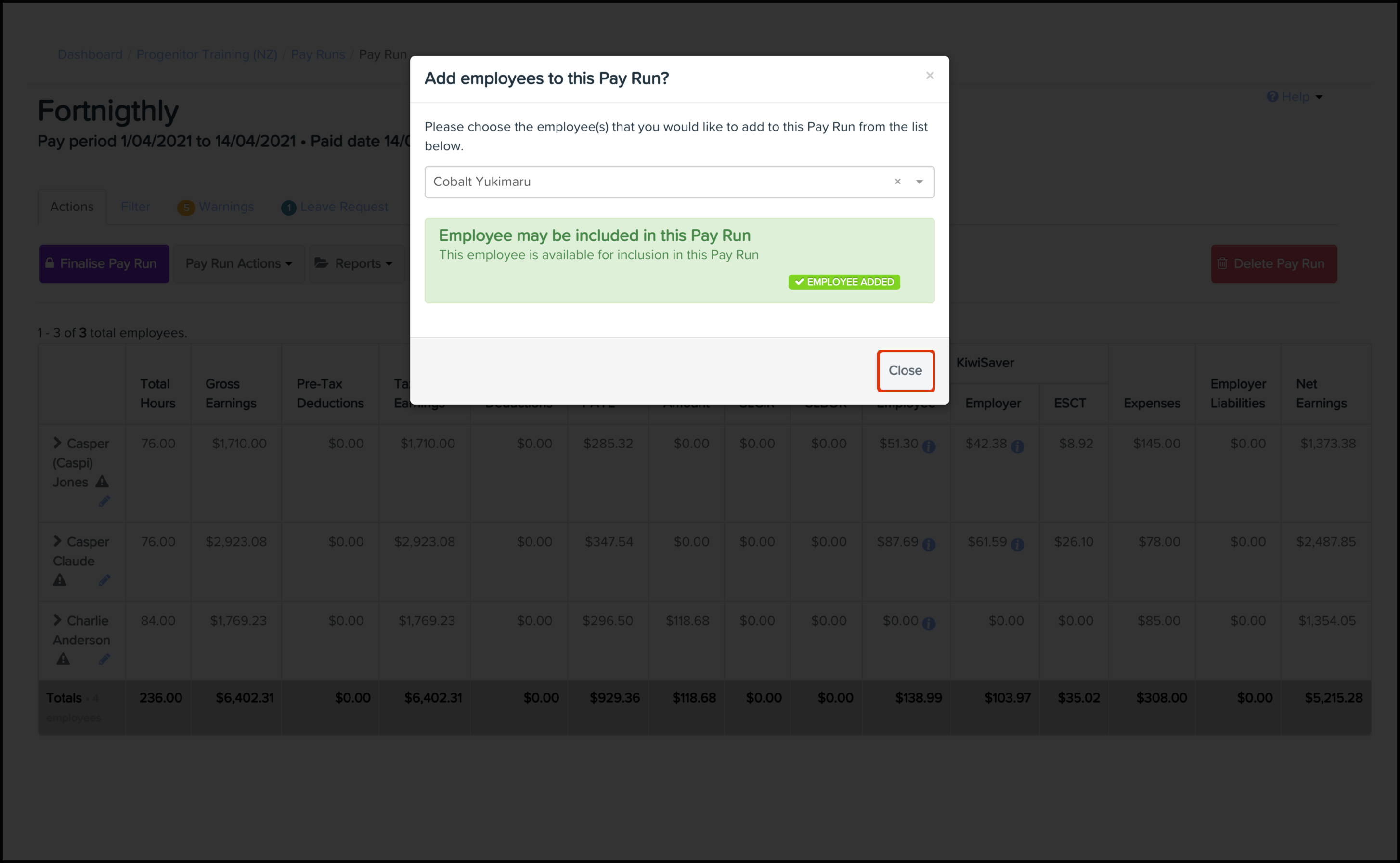 - In the Add employees to this Pay Run? window, enter the name of the required employee in the drop-down field.