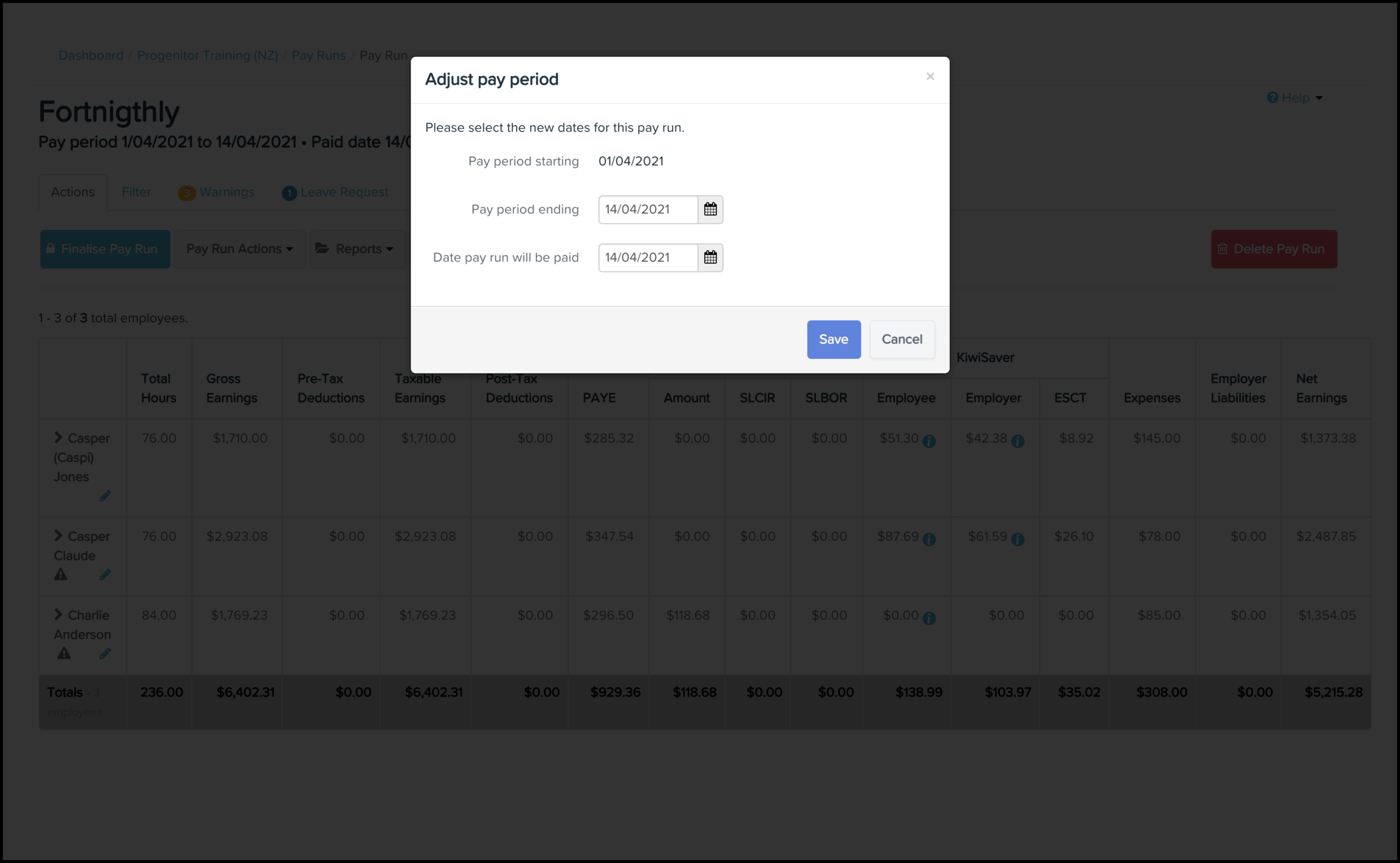 - Under the Pay period column, click the pay run that needs to have dates adjusted.