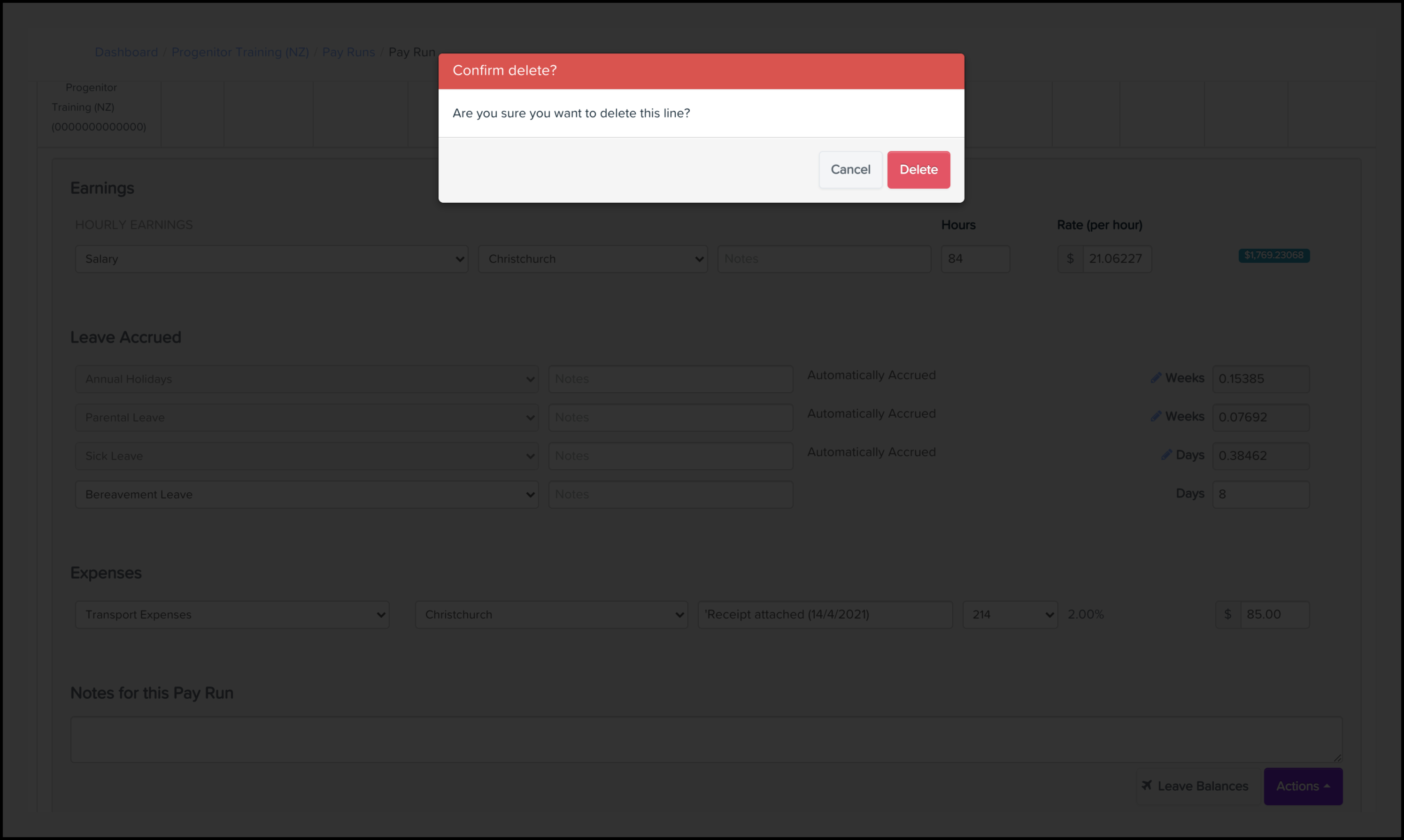 You can use the Accrued Leave feature within the Pay Run module to add an extra accrued leave line and specify details such as the leave category, leave value, and any required supporting notes. You can also use this feature to delete a leave accrued line if you added it in error.