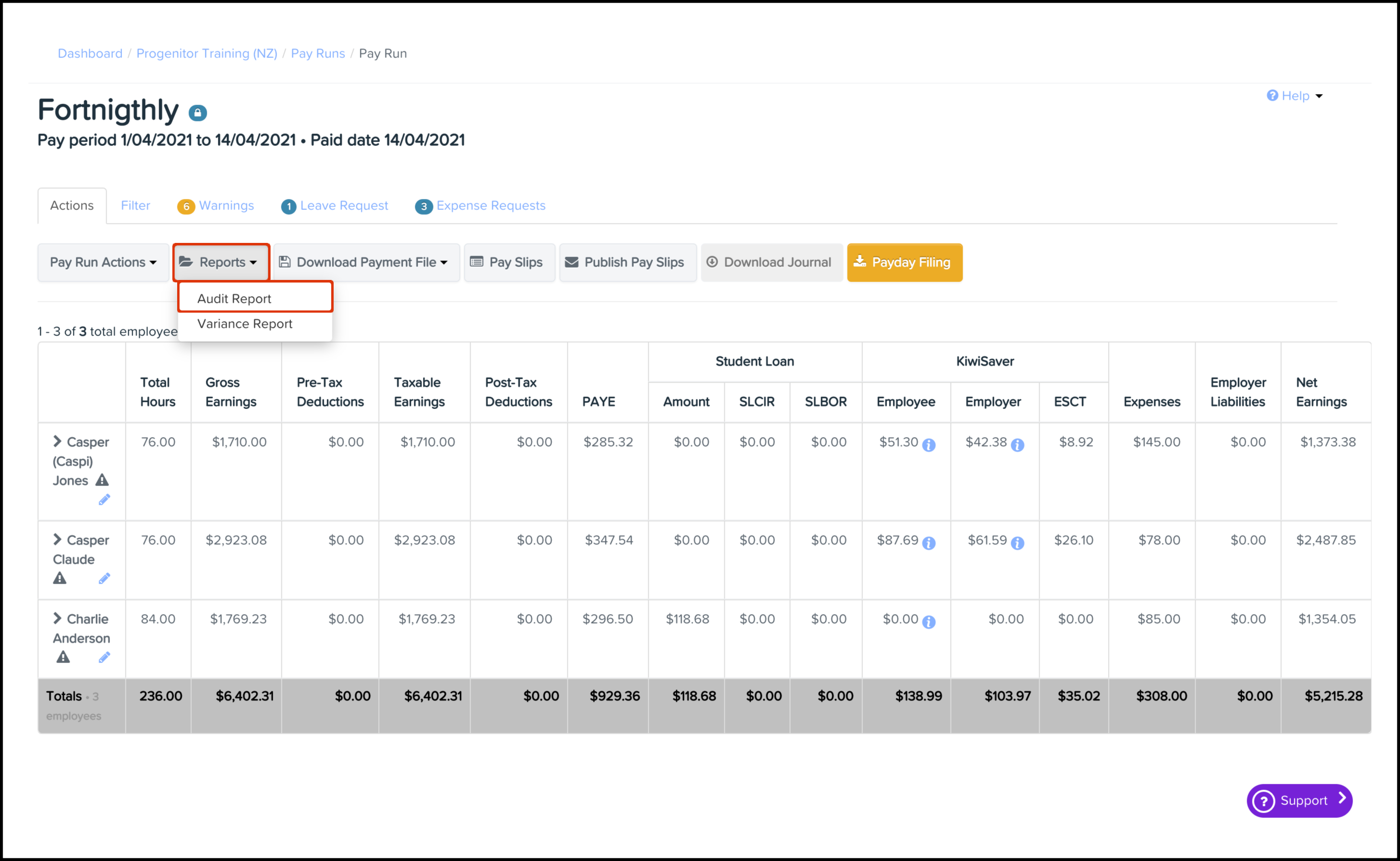 The Pay Run Audit Reporting feature allows you to create a report that you can use to analyse a pay-run conducted within your organisation and see details such as the deductions made, the PAYG adjustments and the leave accrued. You can also use this feature to download an excel file of this data or save the information in a printable PDF format.