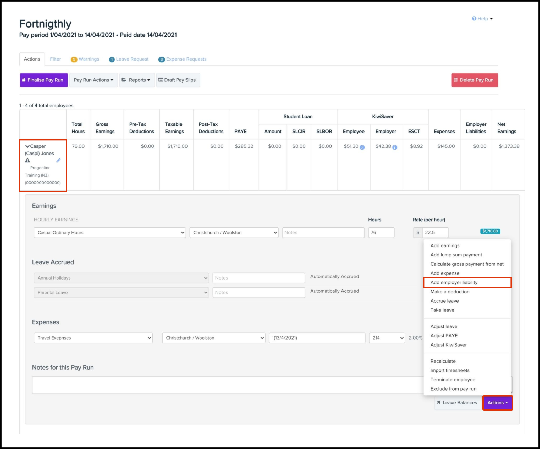 Before assigning a liability, you need to create the employer liability category. To read further details on how to create this, refer to the following article. Once you have created your category, a pay run needs to be created next, before you can add or remove an employee liability line within your pay run. To read further details on how to create a pay run, refer to the following article.
