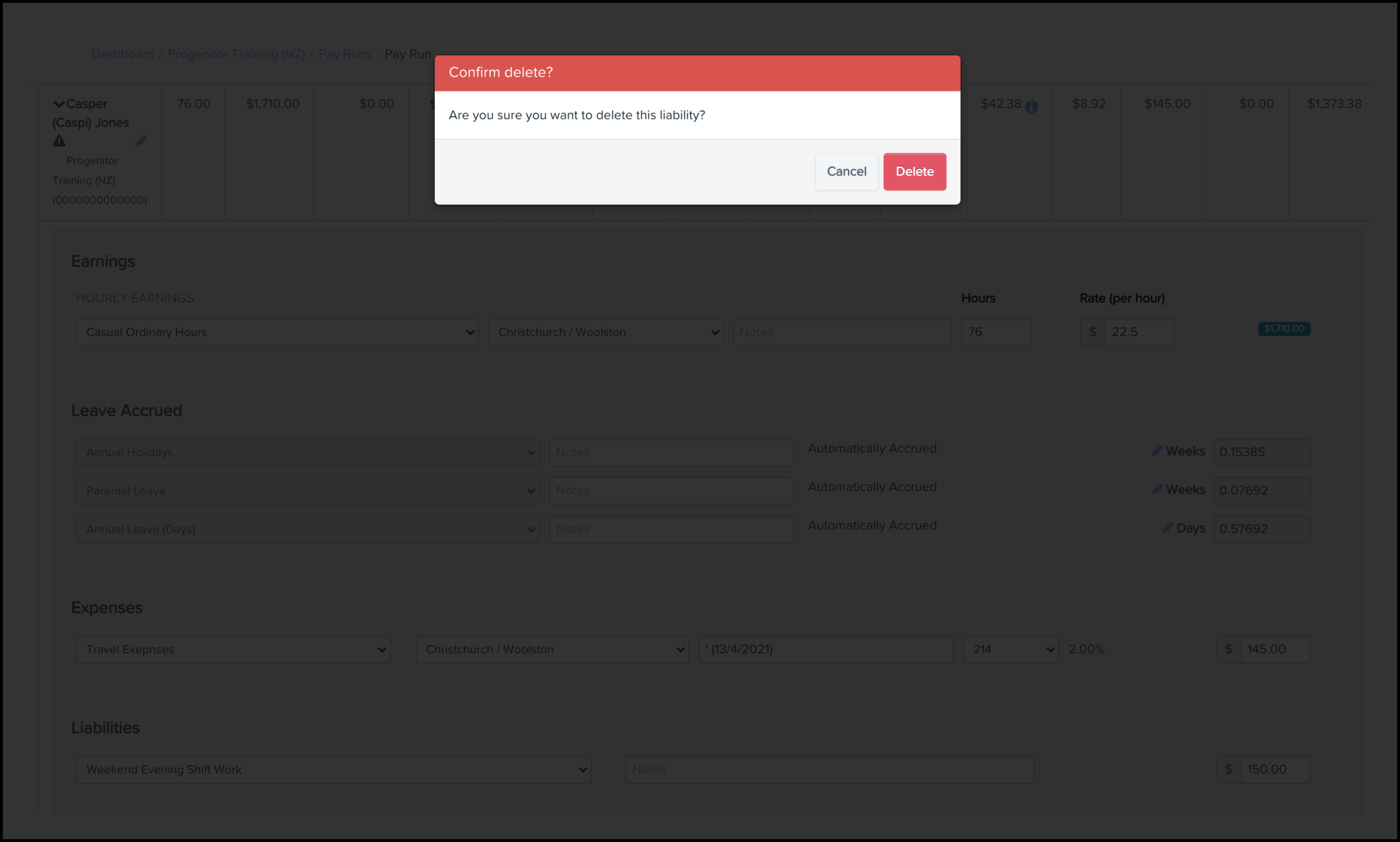 You can use the Employee Liability feature within the Pay Run module to add an employee liability line and specify details such as the liability category, units, and any required notes. You can also use this feature to delete an employee deduction line if you added it in error.