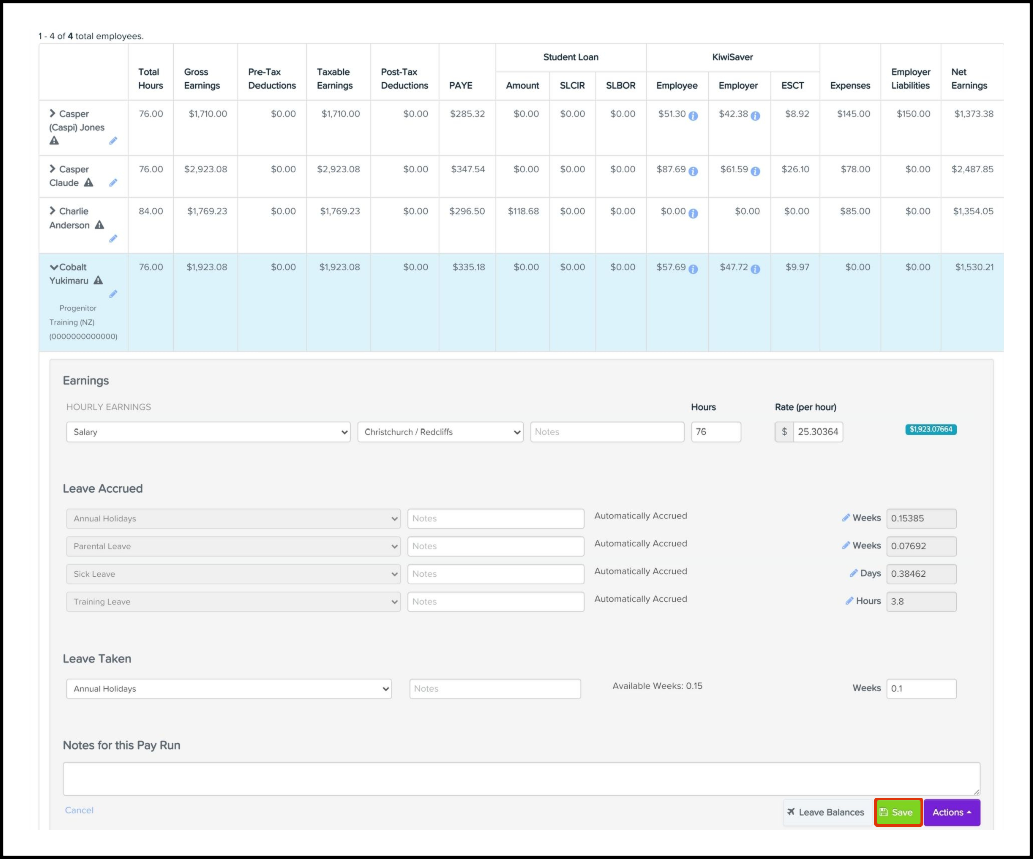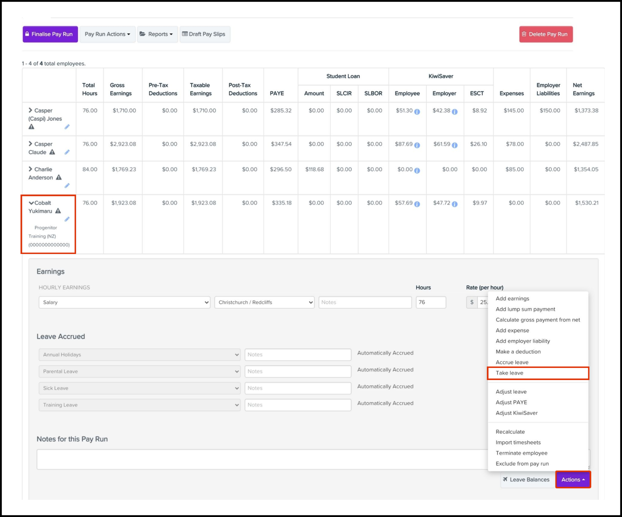 You can use the Taken Leave feature to add an extra taken leave line and specify details such as the leave category, leave value, and any required notes. You can also use this feature to delete a leave-accrued line if you added it in error. A Pay Run needs to be created first, before you can add or remove employee-taken leave lines.