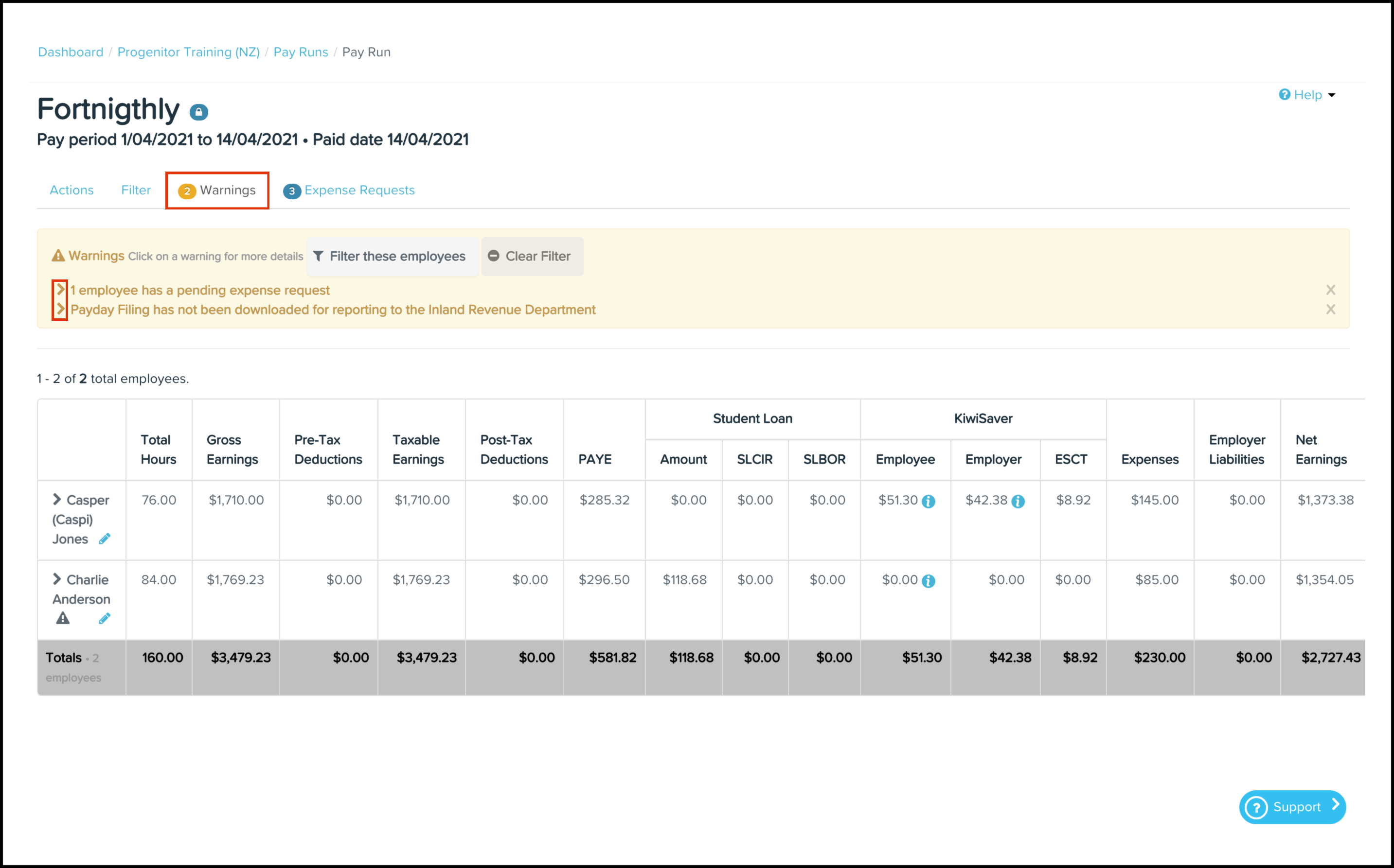 | Employee with unpaid earnings. | The platform displays this warning when an employee has an earnings line with hours applied, but the total value of the earnings line is 0(zero). This usually shows there is an error with the employee's rate of pay. |