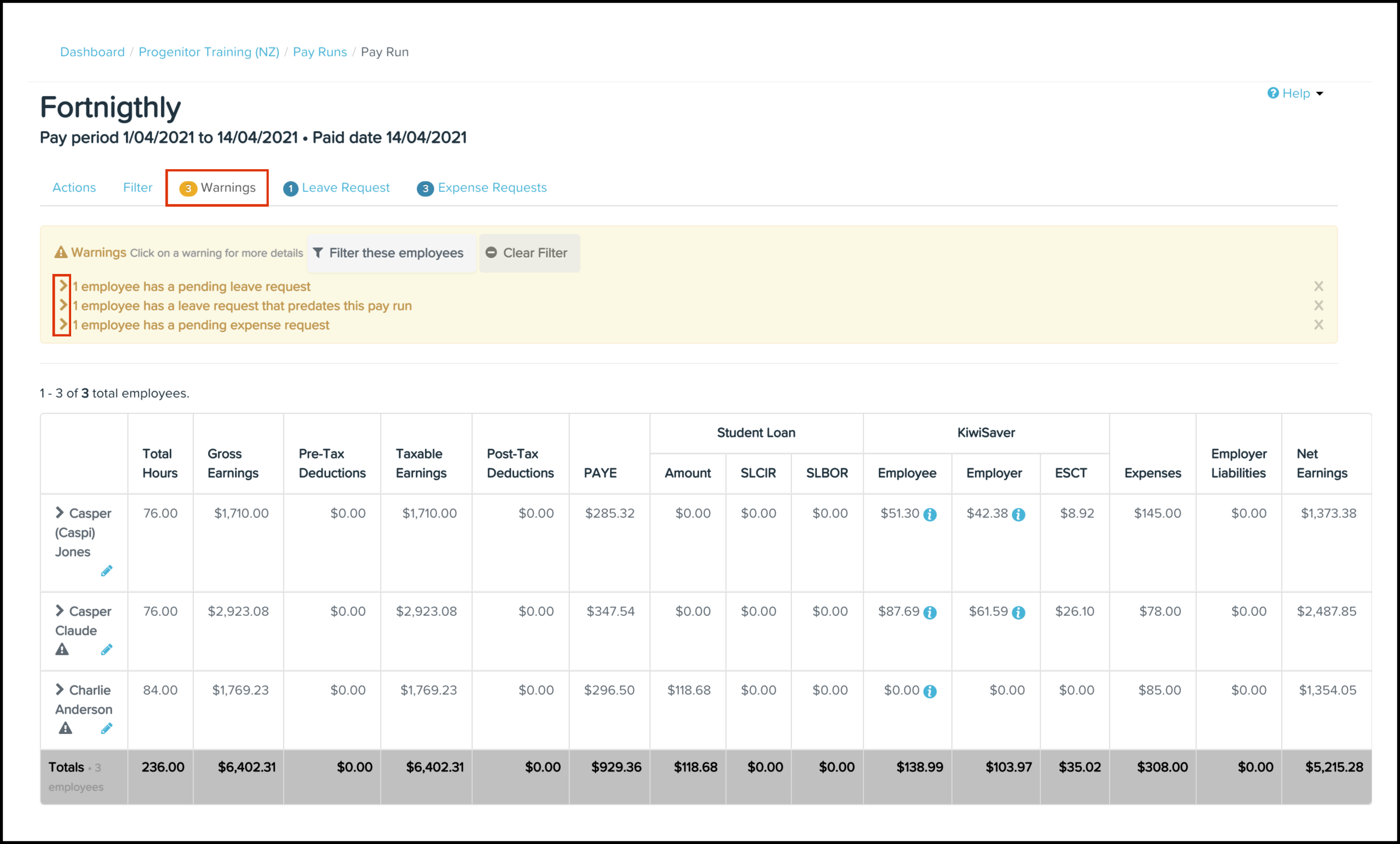 | Employee with unpaid earnings. | The platform displays this warning when an employee has an earnings line with hours applied, but the total value of the earnings line is 0(zero). It usually shows there is an error with the employee's rate of pay. |