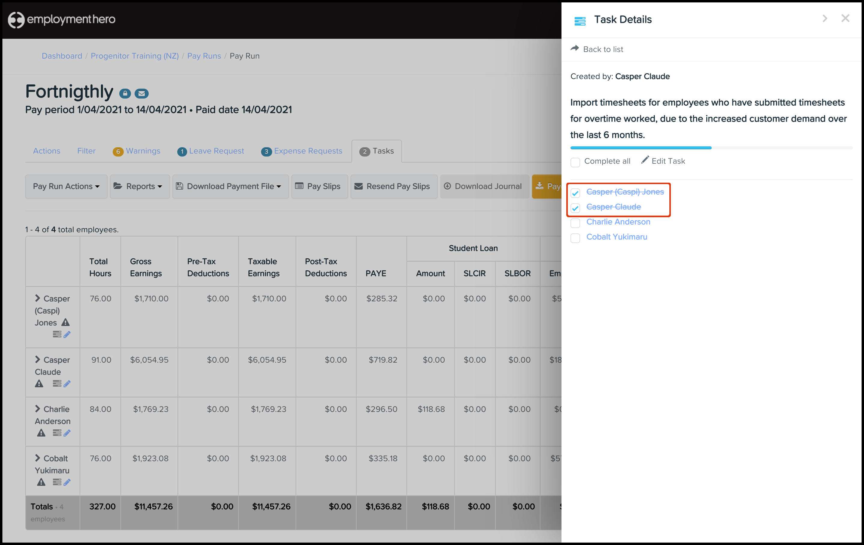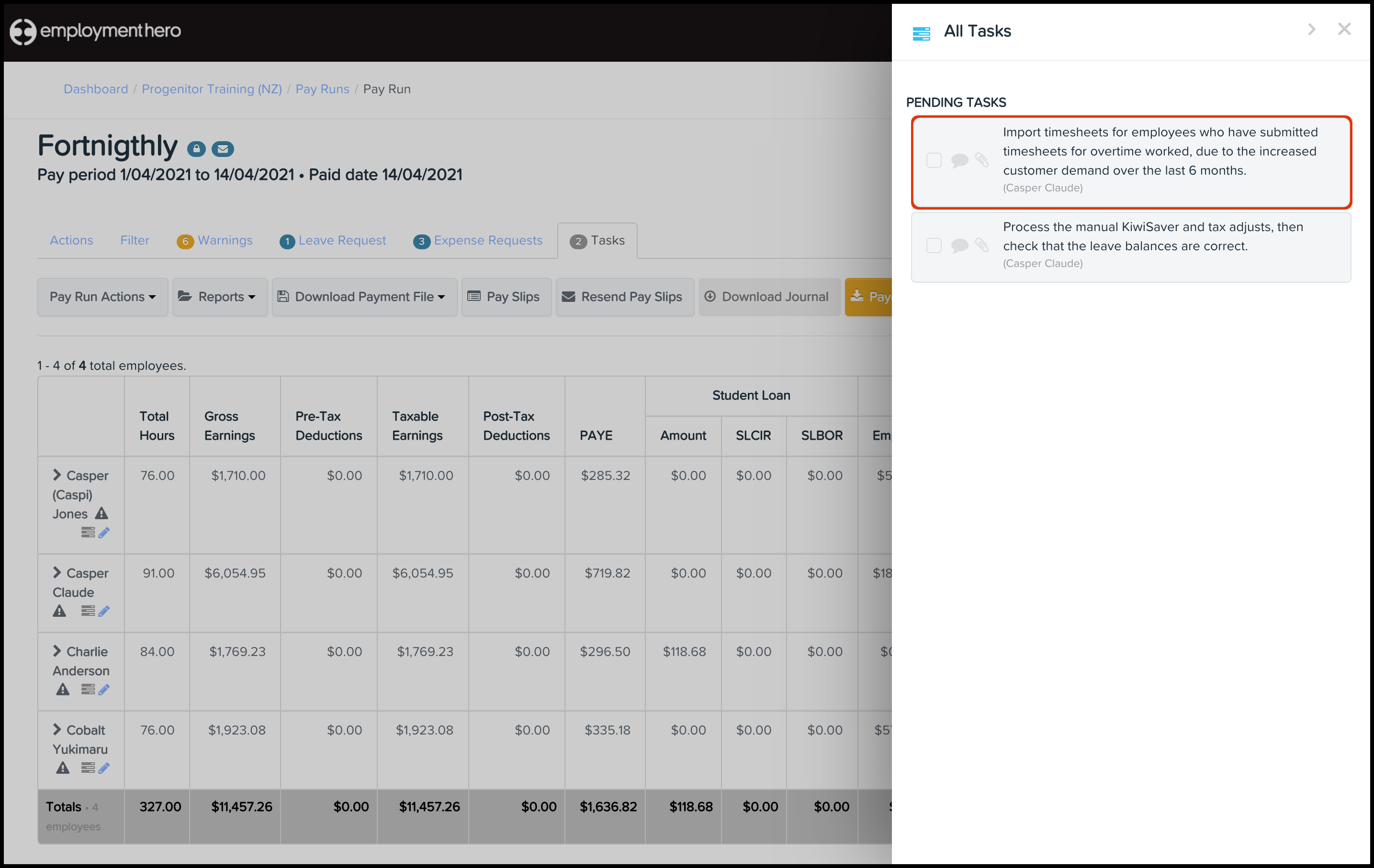 With your organisation, you would have a list of tasks that need completing, such as checking whether the platform correctly imported your employees timesheets or a reminder to check the correct application of an employee's leave adjustment. By having a task list where you can track these jobs will reduce the administrative time you spend on this area of pay run management.