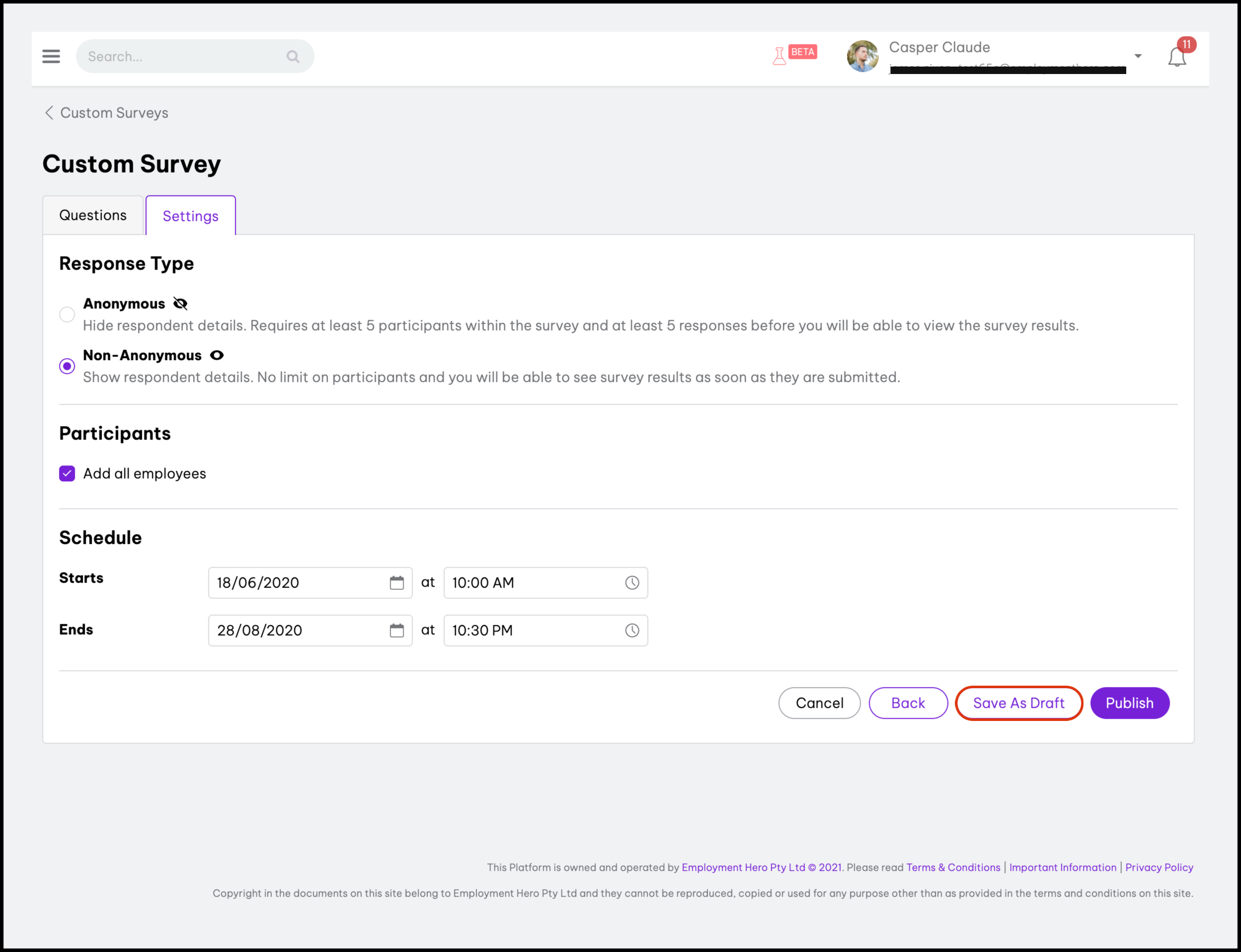 If you want to send the survey out immediately to the selected users, click the Publish button, i.e., the survey becomes available on the selected user's dashboard.