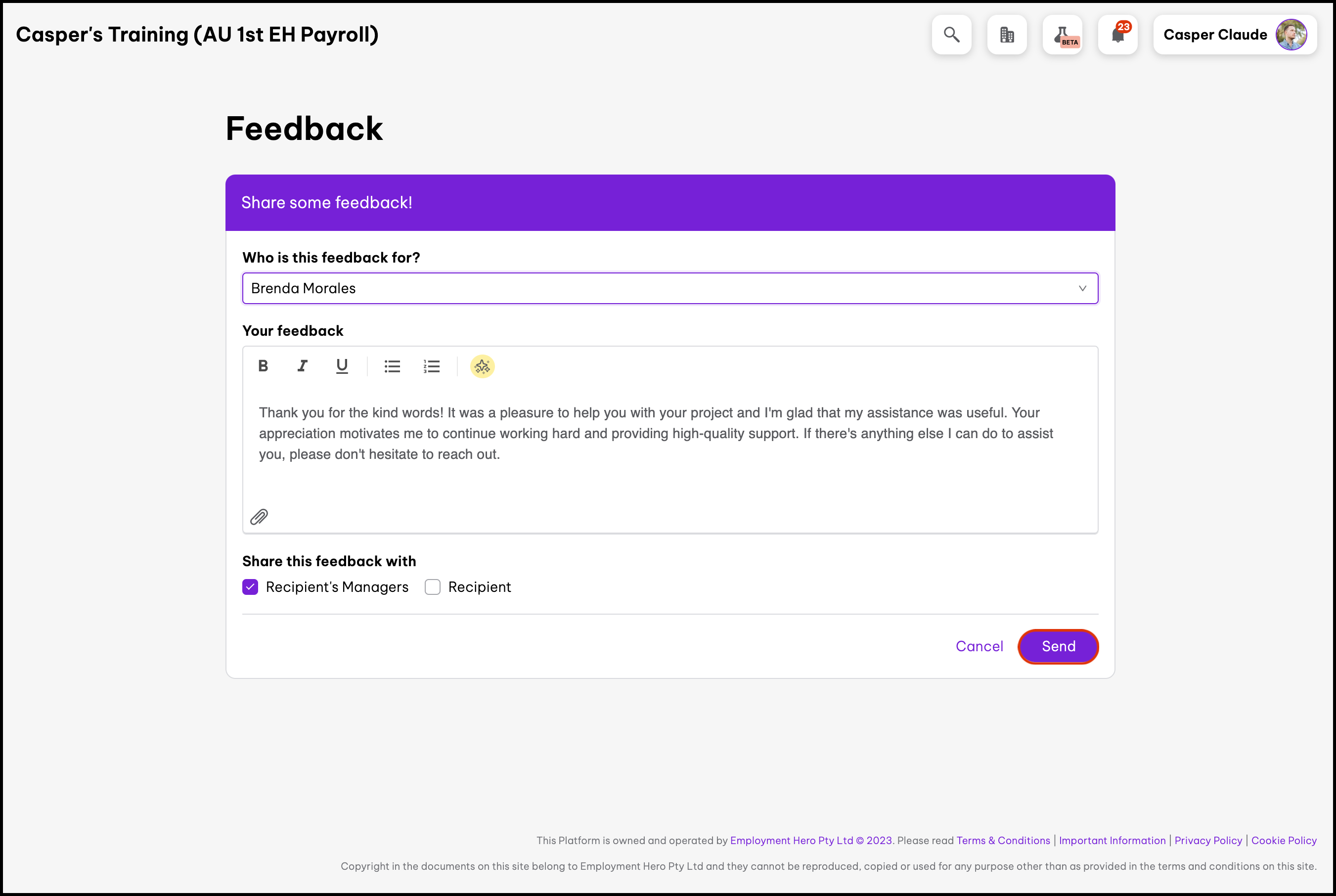 • Give a teammate recognition This feature allows you to send a message on the company feed showcasing a coworker who lives up to your organisation's values.
