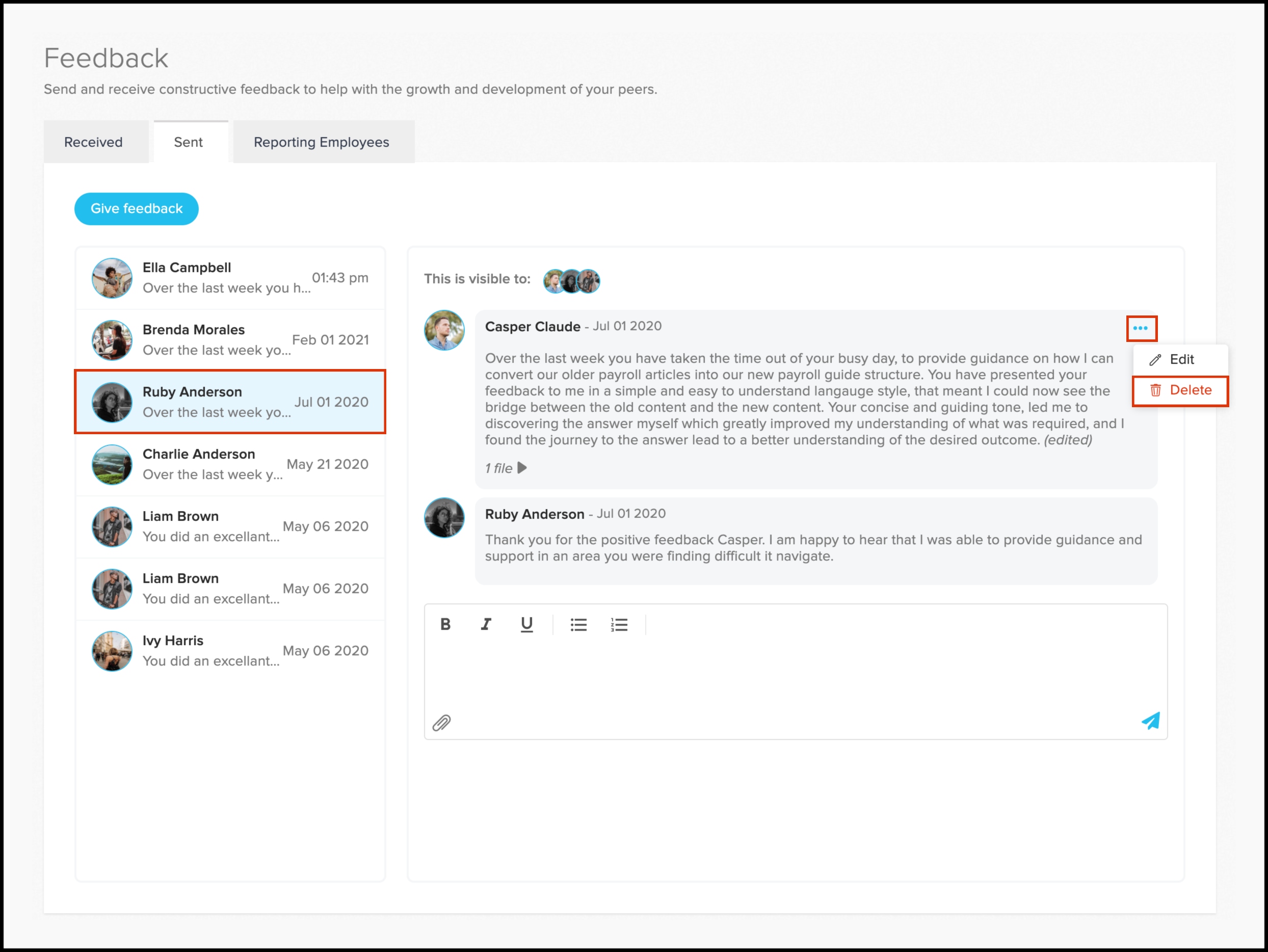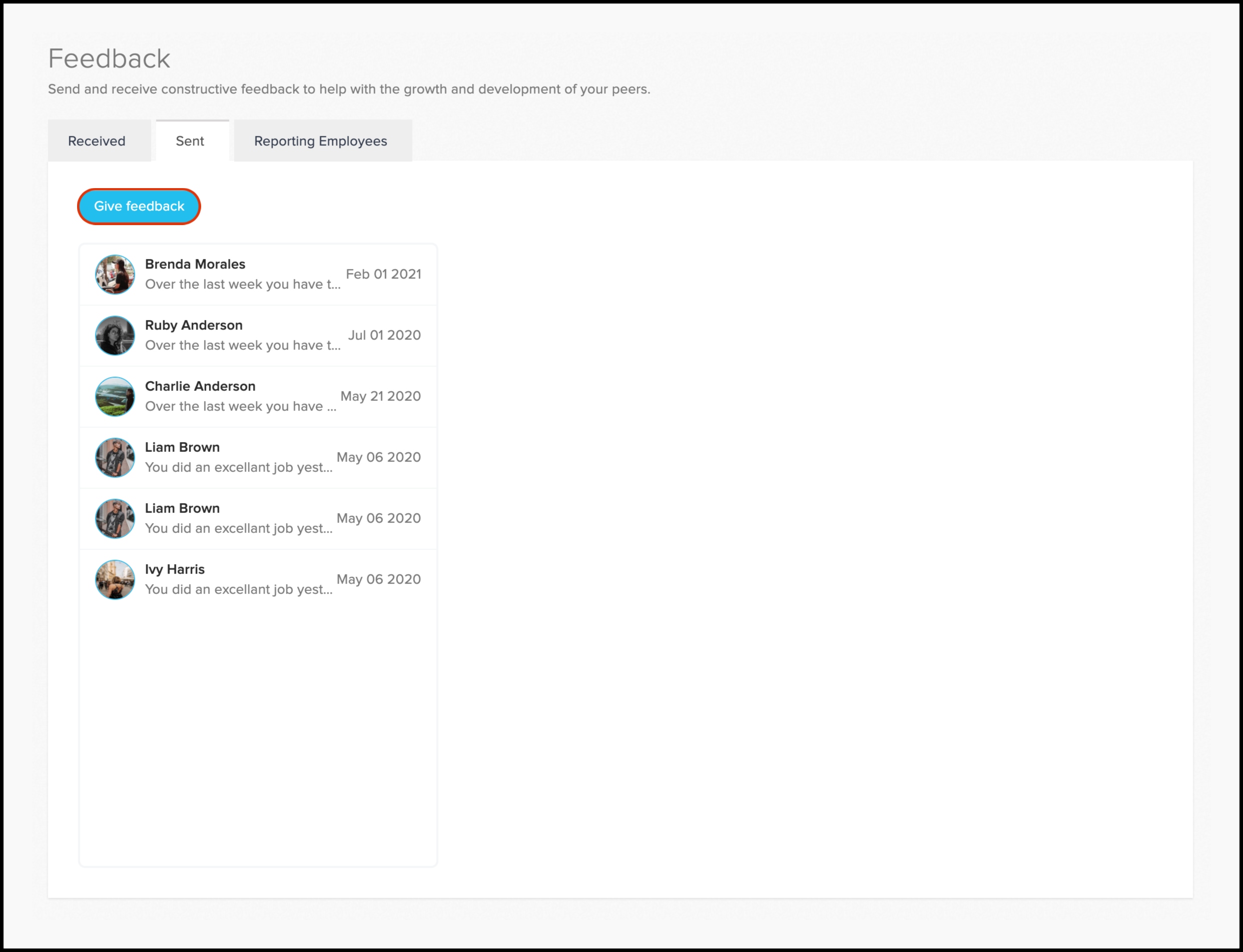 Screenshot of the HR platform showing how to view all employee feedback