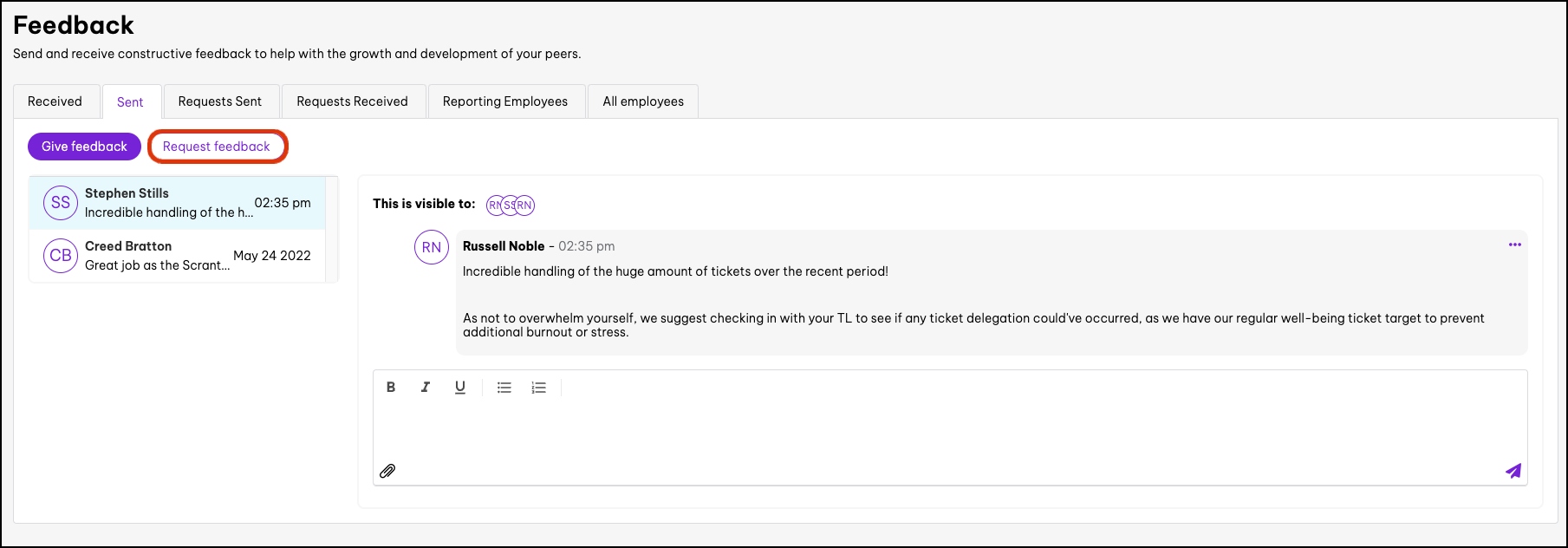Only Admins and Owners are able to see feedback for all employees.