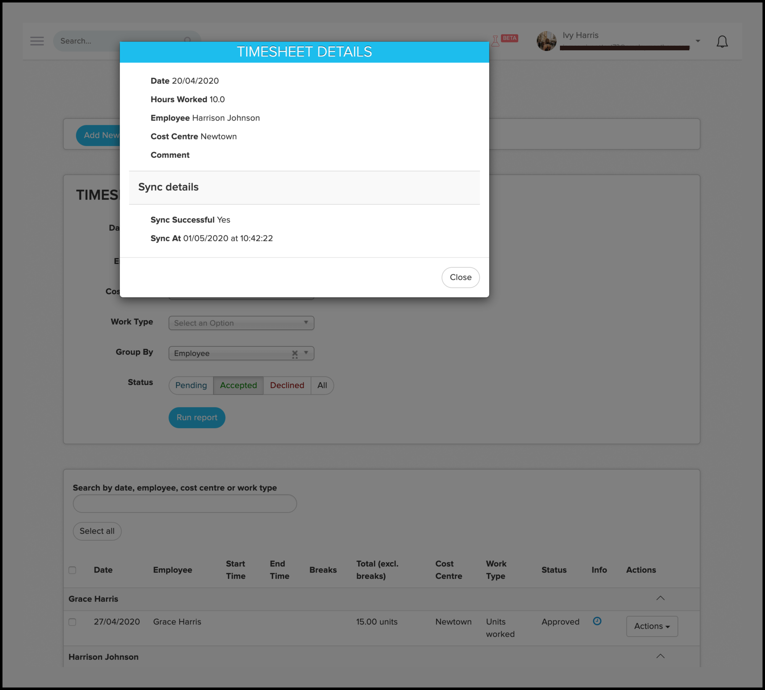 | Synced at | Provides a timestamp of when the timesheet tried to sync with your EH Payroll classic platform. |
