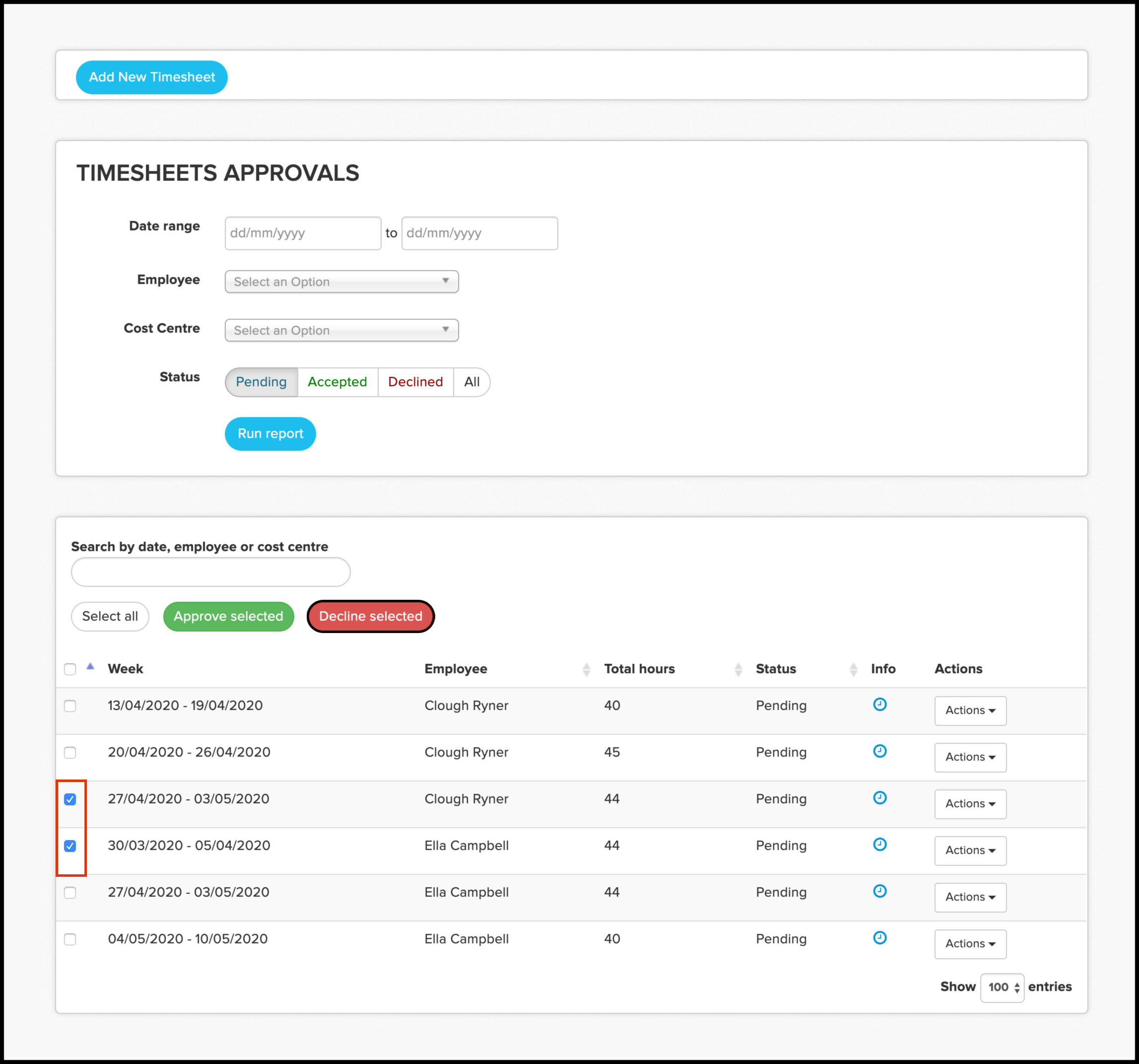 - Use the tick box to select each timesheet that needs to be declined.