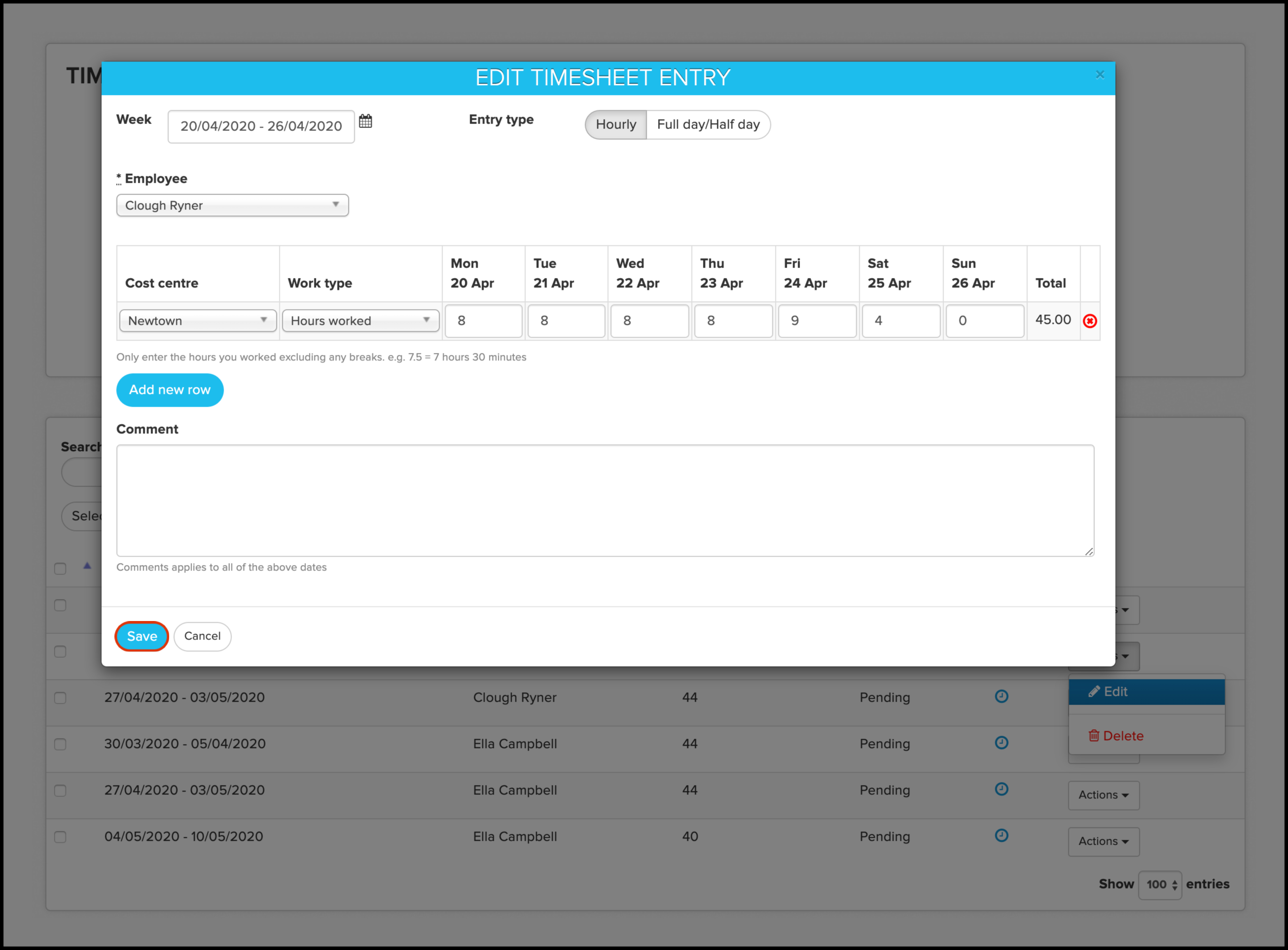 You can add a new row by clicking the Add New Row button. You can delete a row by clicking the Delete button at the end of the timesheet row.