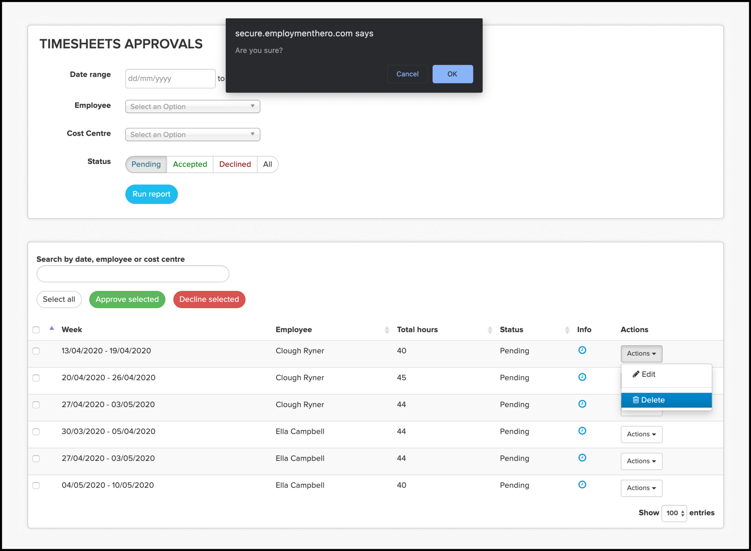 The Employment Hero Manager Timesheet feature lets you approve or decline timesheets in bulk or individually, edit entries, or submit them for employees. You can also delete records if they are no longer required.