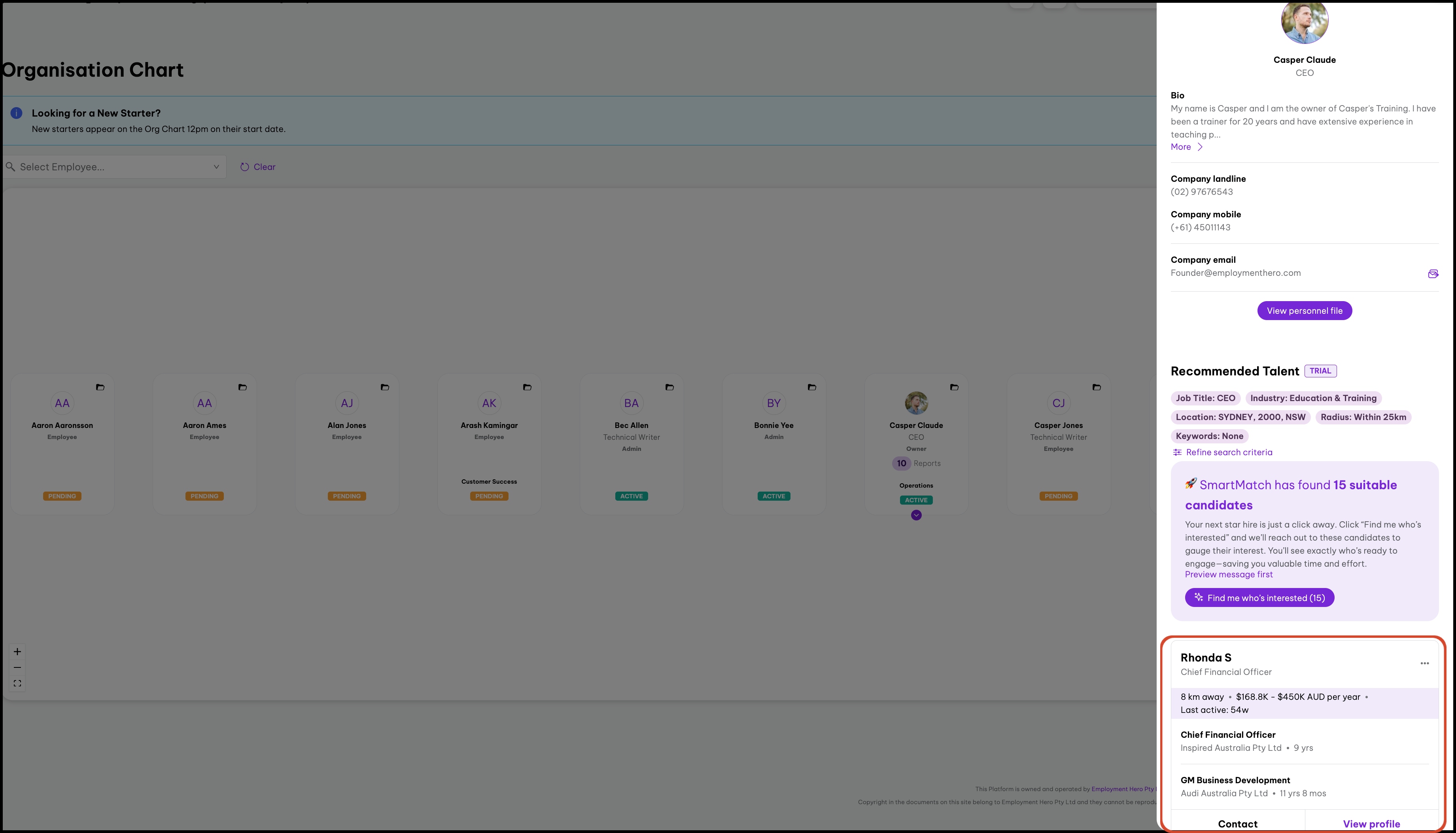 An organisation chart helps your business understand reporting lines, manage team structures, and support workforce planning. With Employment Hero's Organisation Chart feature, you can view and print team hierarchies, view detailed personnel files, and access SmartMatch recommendations for certain roles. This helps ensure employees, managers, and admins alike have clear visibility on individuals in the business and where they are placed in the organisational structure.