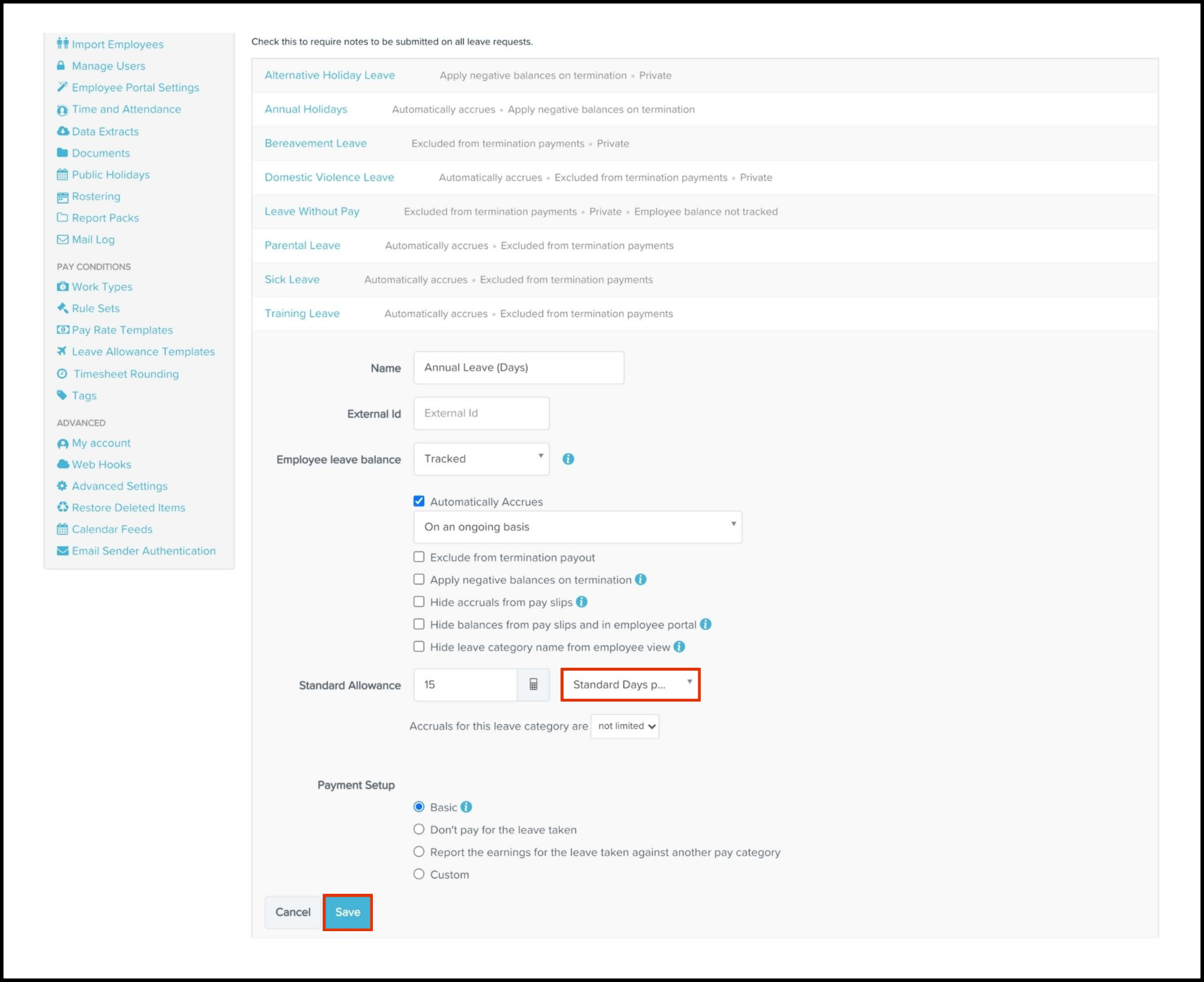You will need to repeat the following steps for each leave category you require your employees to submit in days.