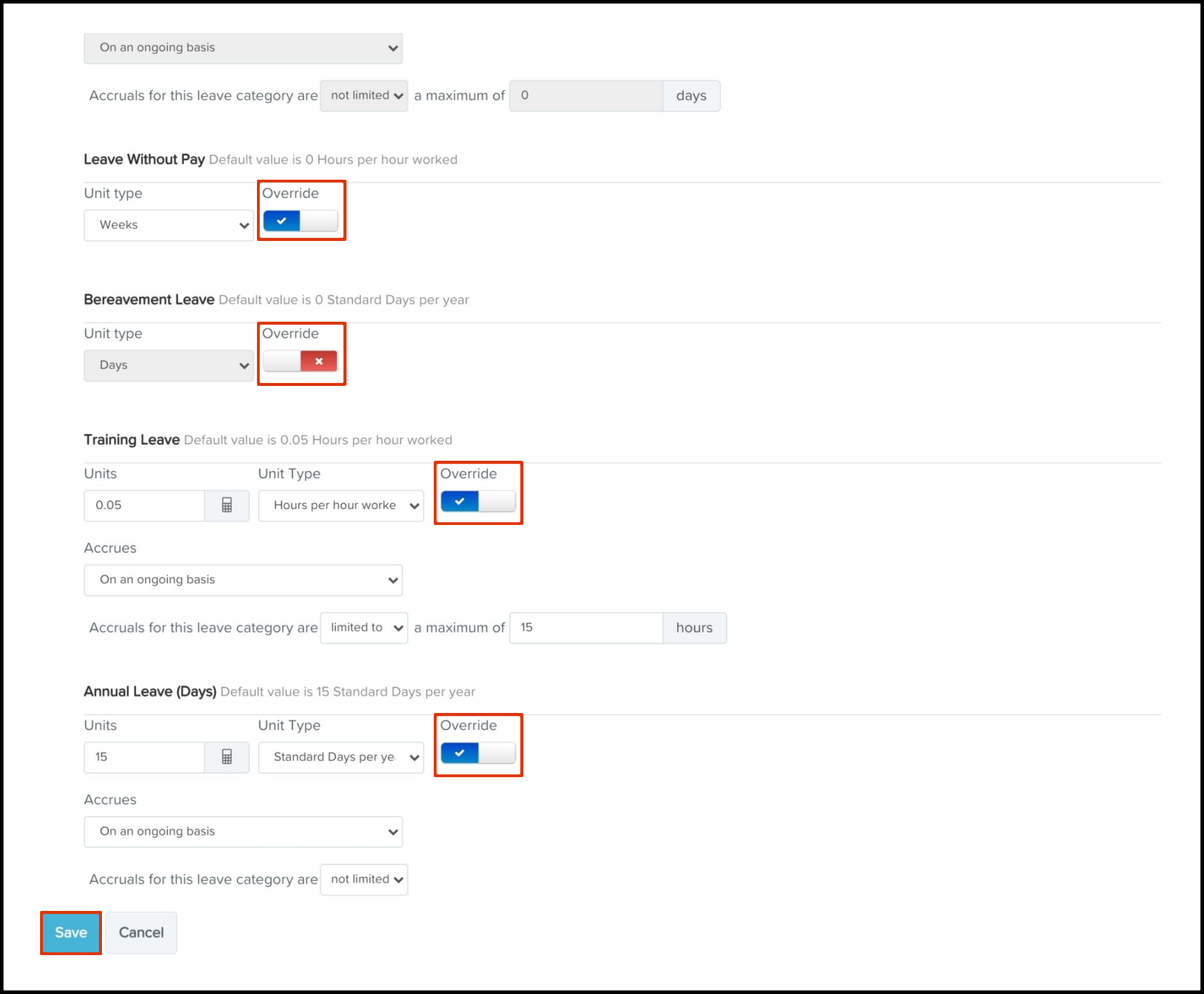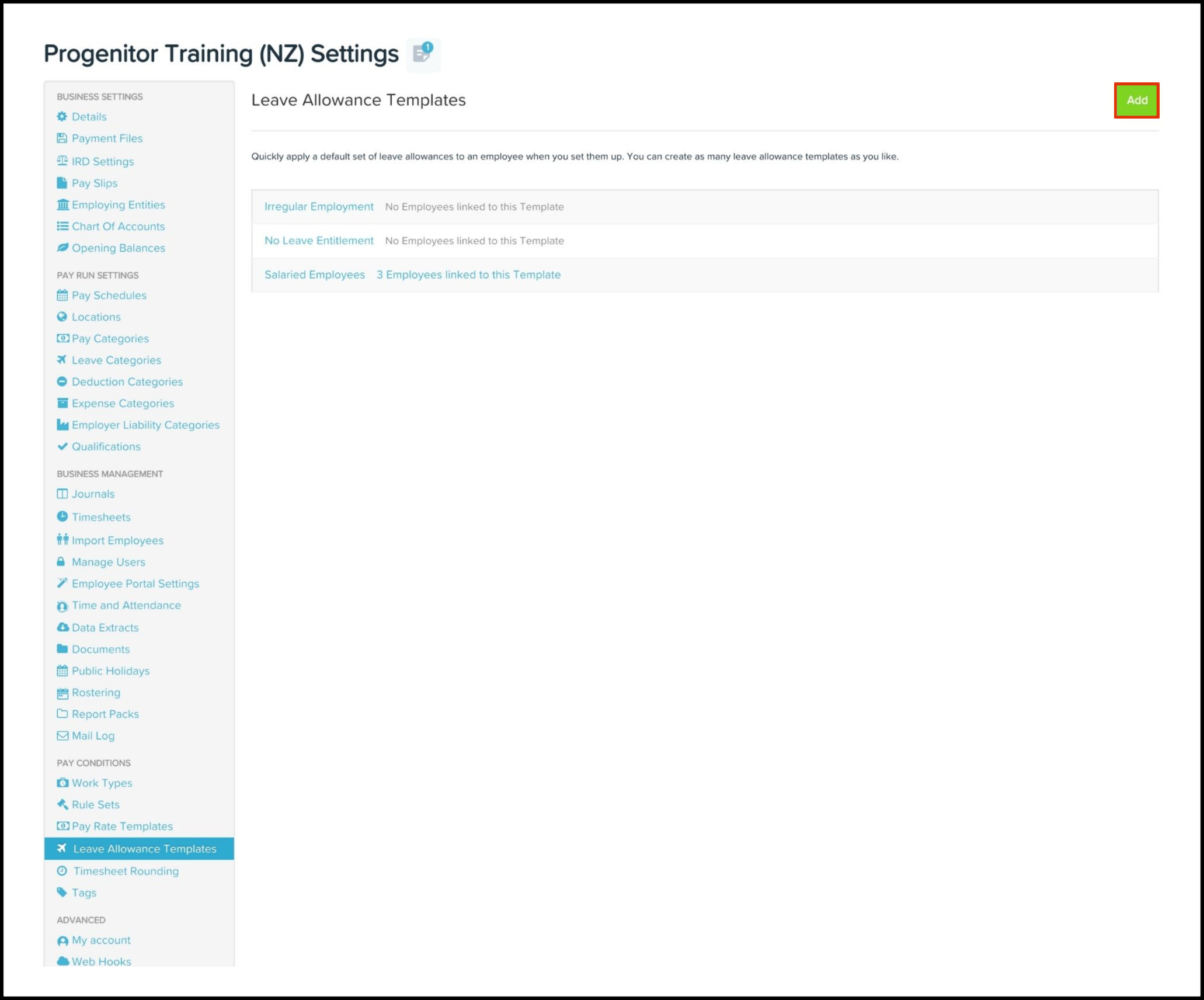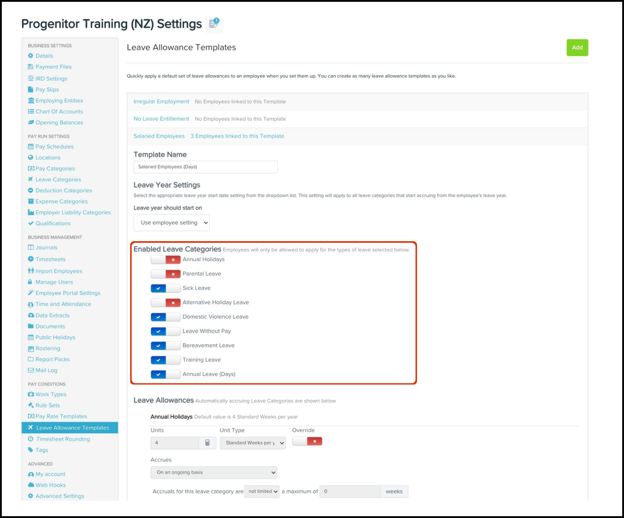 Once you have created your leave categories, you will need to create your leave allowance templates. These allow you to group multiple leave categories together and set the rate at which each category accrues leave in days or weeks. There is no limit to the amount of templates that you can create; this is because the platform allows you to assign templates per employee. The steps on how to undertake this are: