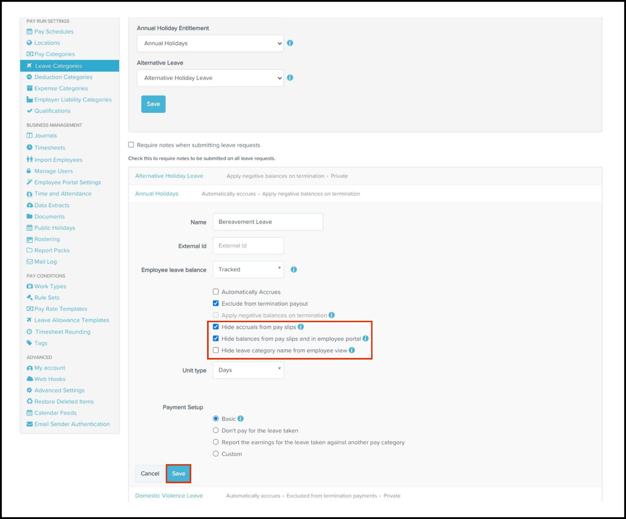 Select this option if you do not wish to allow employees to see the balance of this leave category on their pay slips or in the leave feature within the HR classic platform.