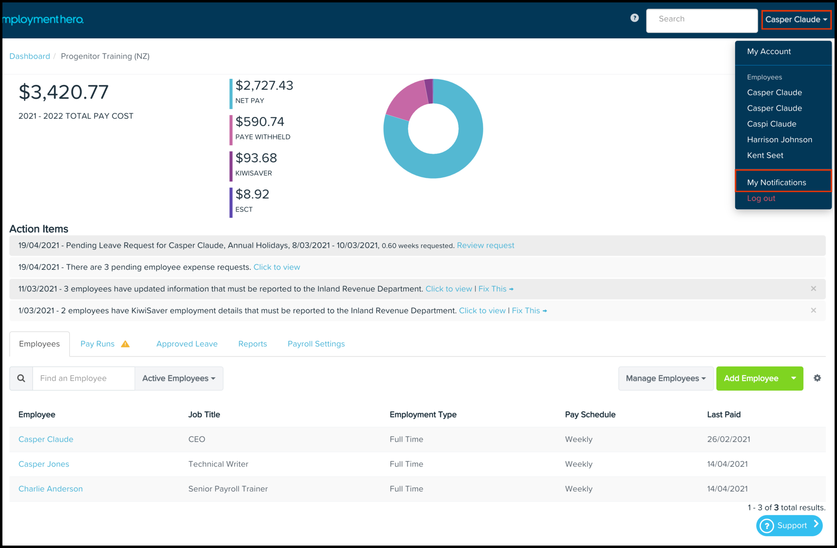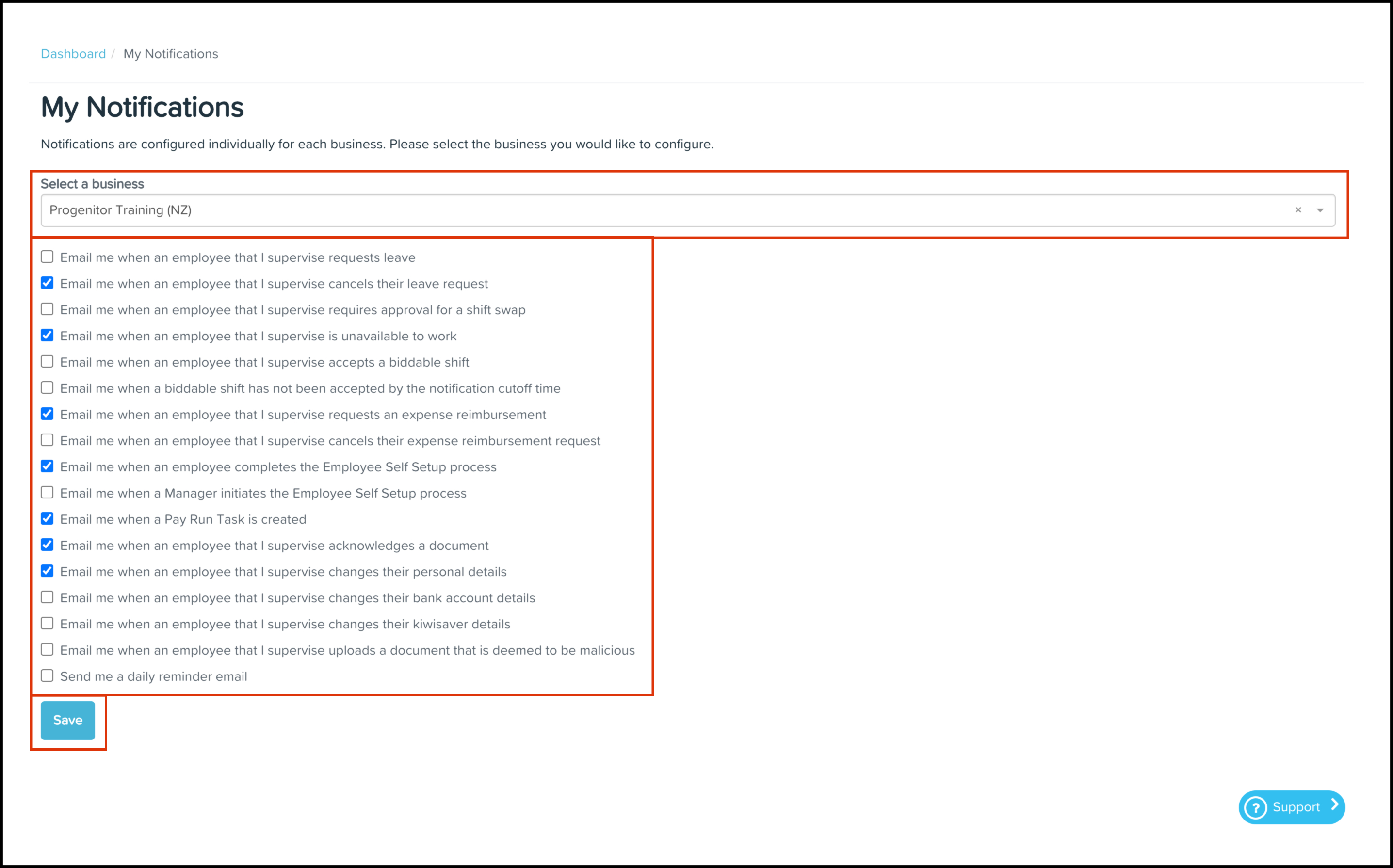 The My Notification feature allows you to turn on or off what email notifications you receive from the payroll platform. These email options cover areas such as expense reimbursements, lodgement errors, pay events and more, giving you control over what messages you receive.