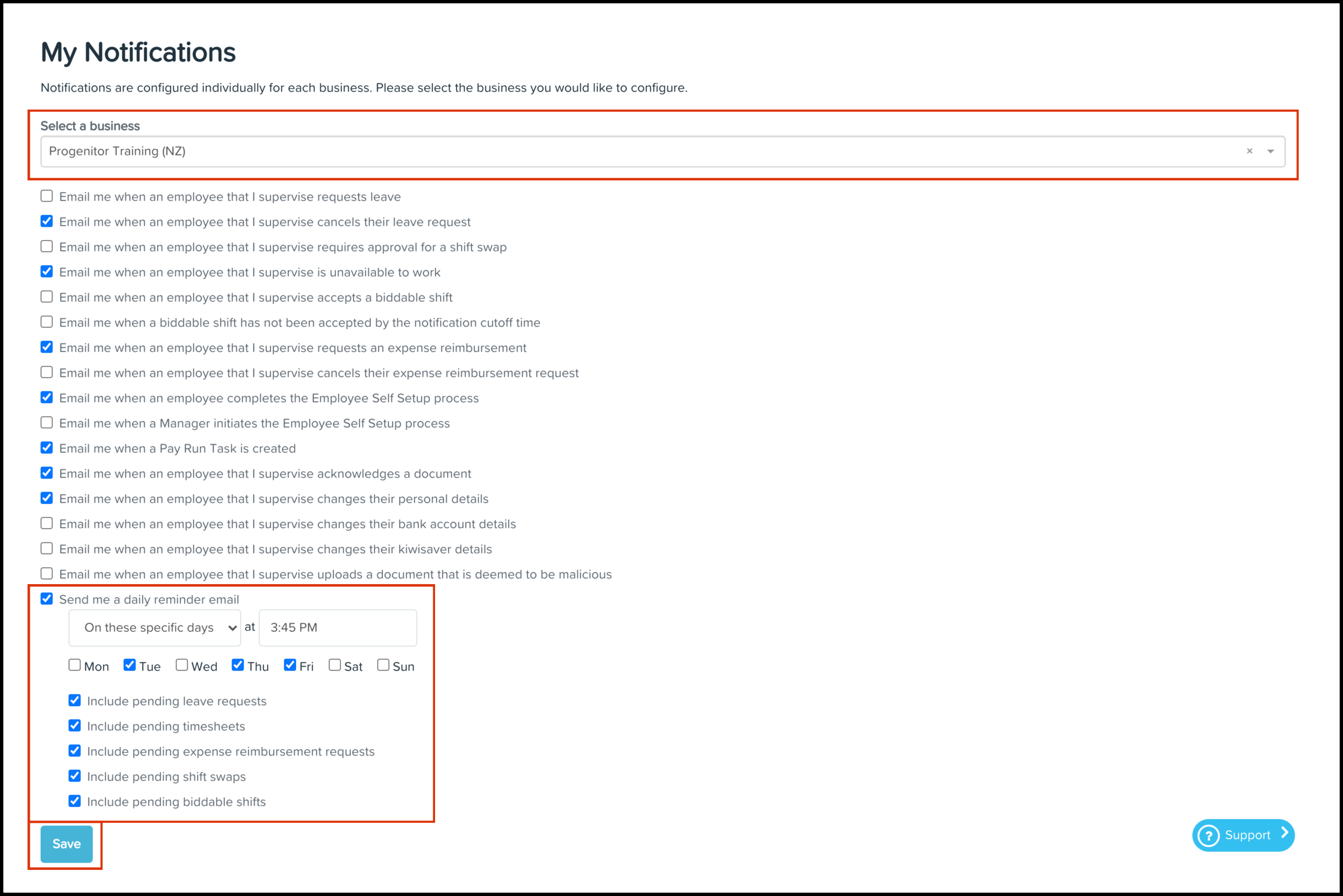 This feature also allows you to create a daily reminder email that will give you an overview of the activities undertaken within your payroll platform. You can select what topics the platform will include in these emails and what day and time you will receive them.