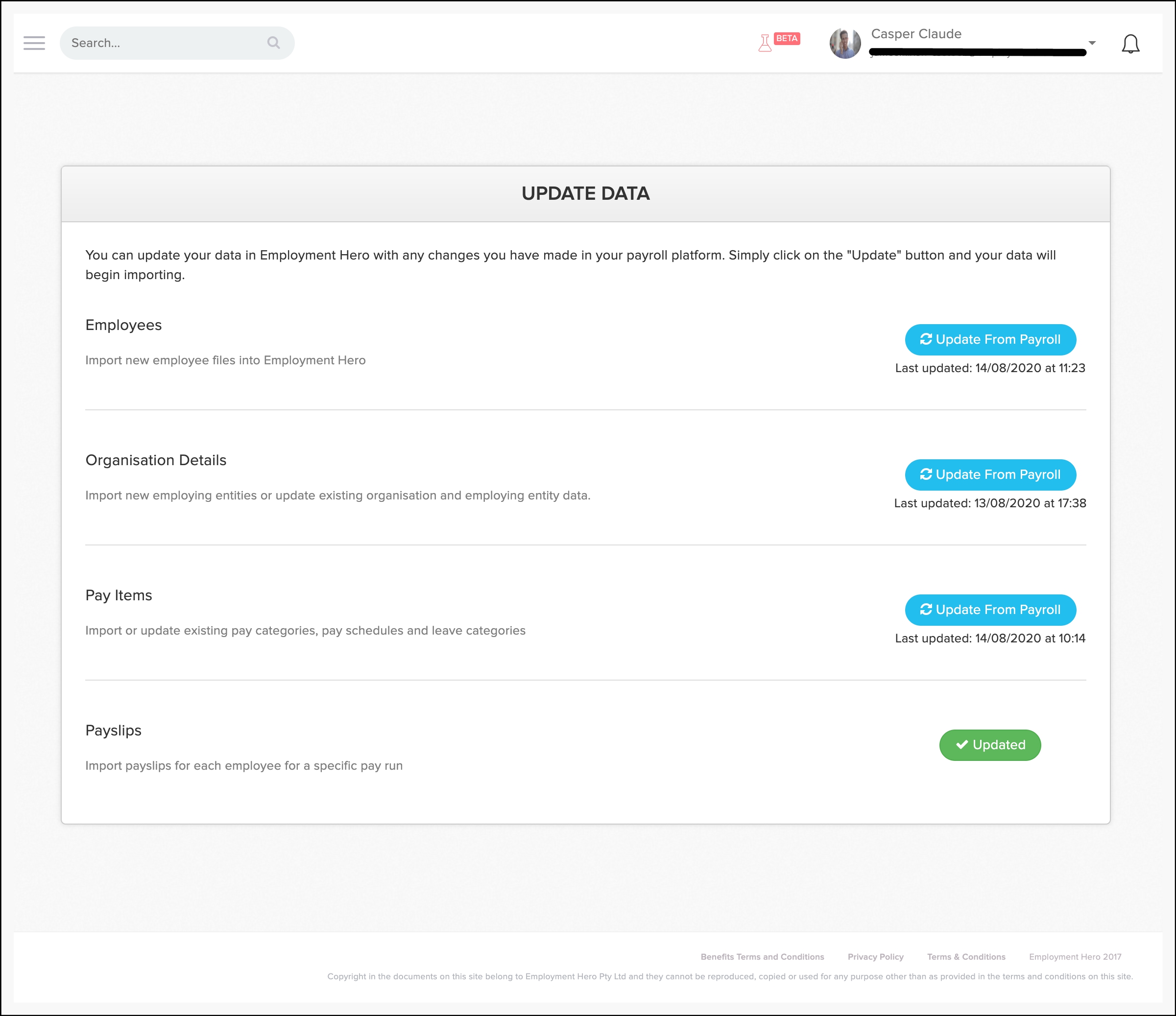 The Payslips section will now show a green Updated button and means Employment Hero has successfully imported your selected Xero data.