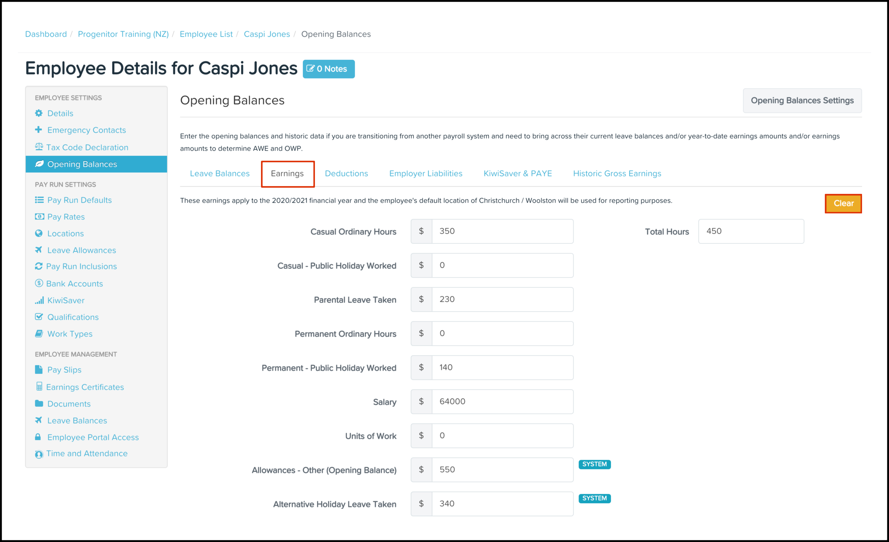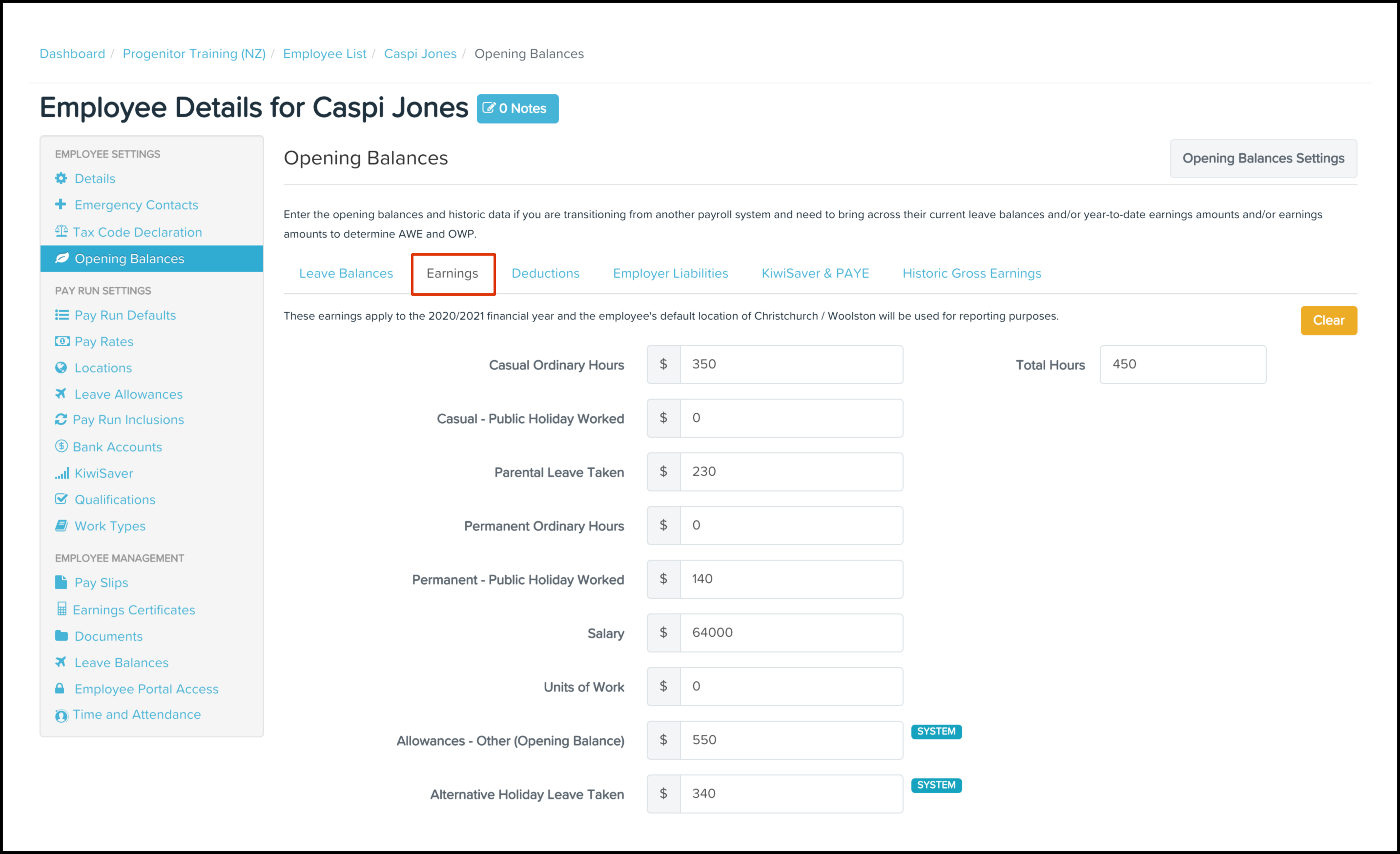 The Opening Balances Earnings feature allows you to select an employee file and enter their accrued YTD earning amounts. You can also use this feature to clear the opening balances if you entered the wrong YTD figures into their employee file.