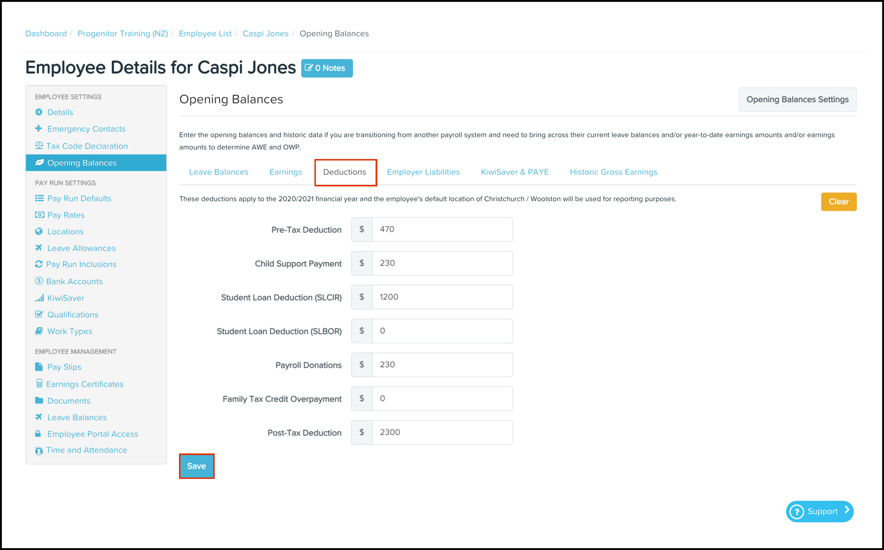 The Opening Balances Deductions feature allows you to select an employee file and enter their existing YTD deduction amounts. You can also use this feature to clear the opening balances if you entered the wrong YTD figures into their employee file. You will need to have your deduction categories setup before you can use this feature. To read further information on how to set up deduction categories, refer to the following article.