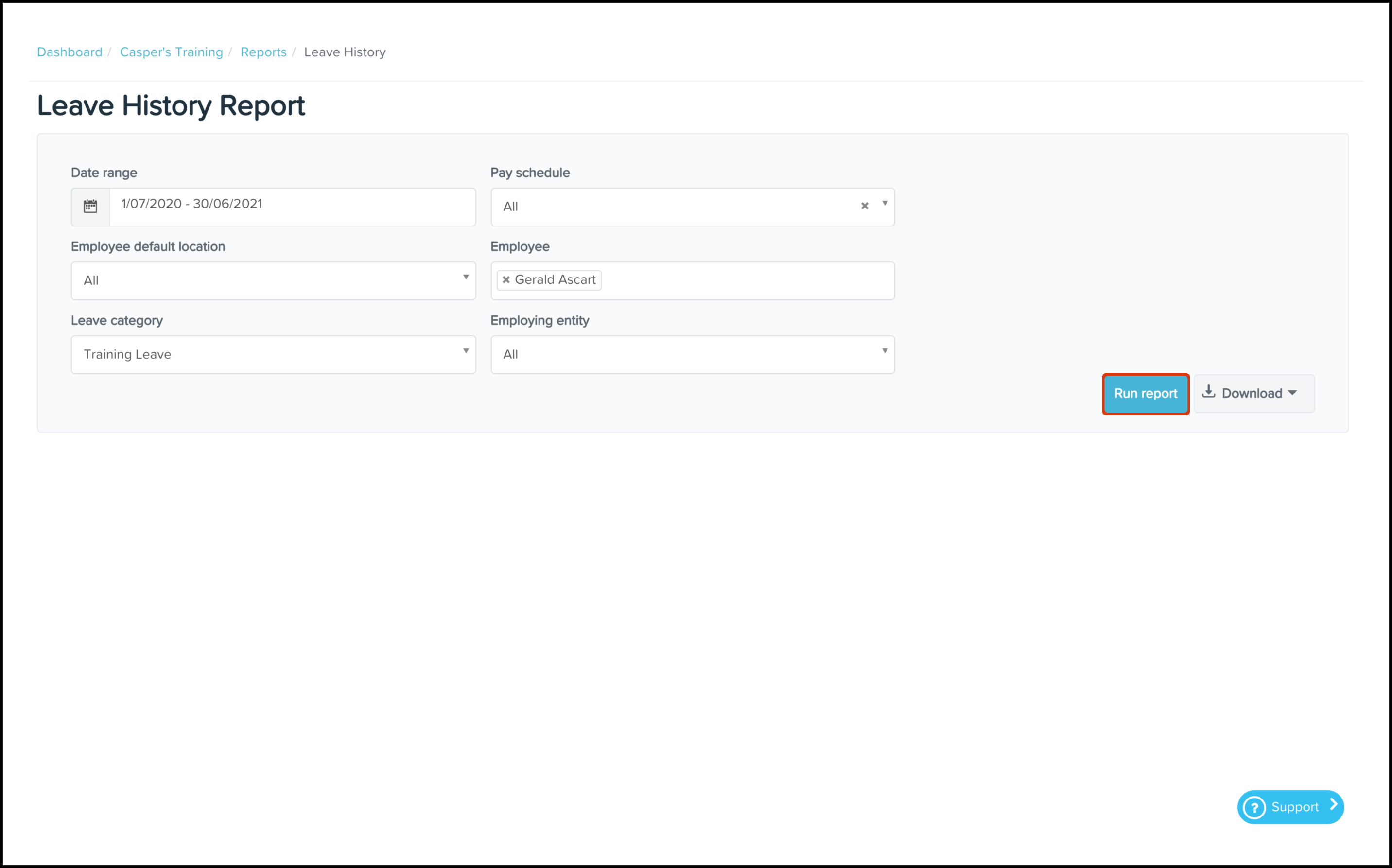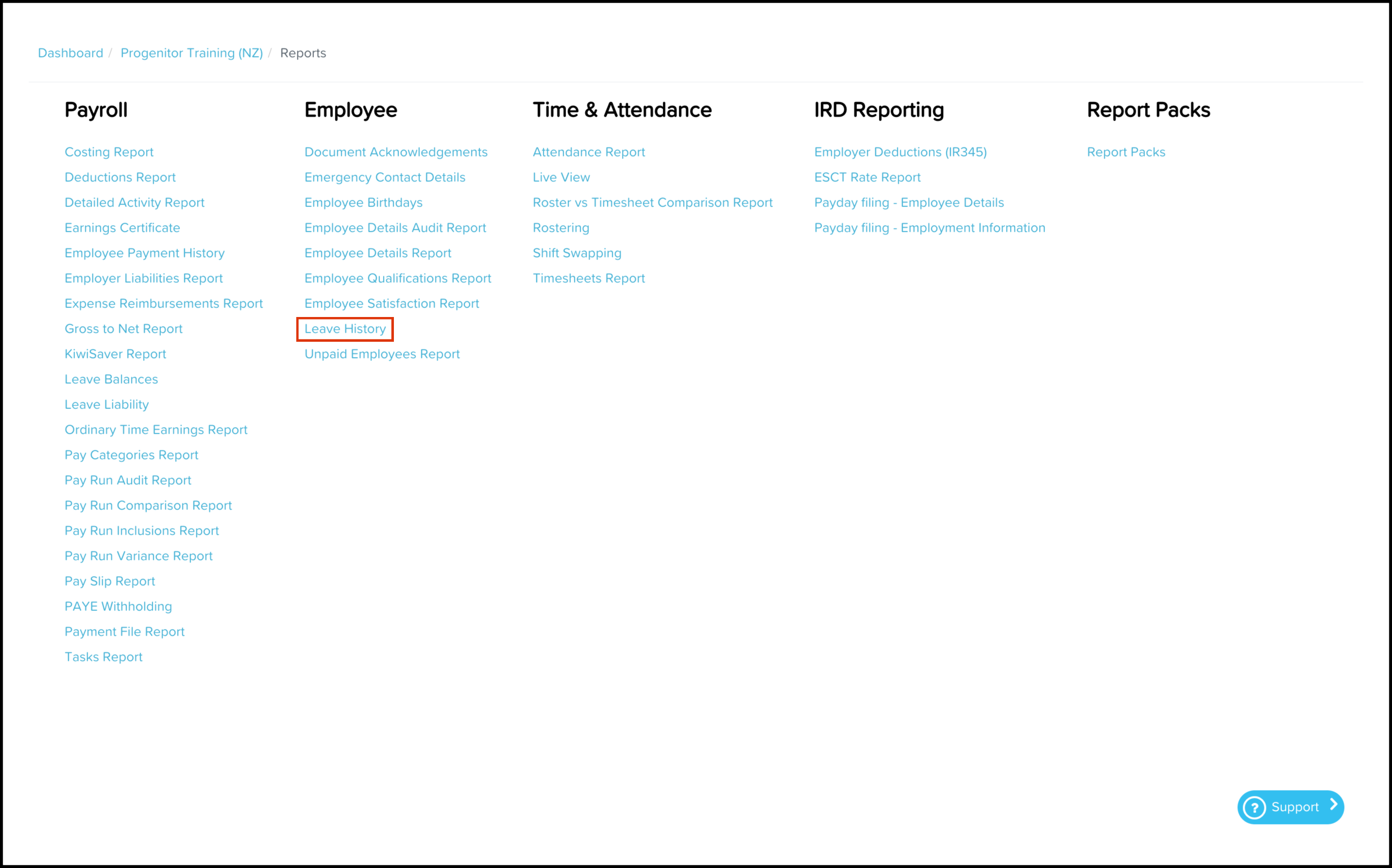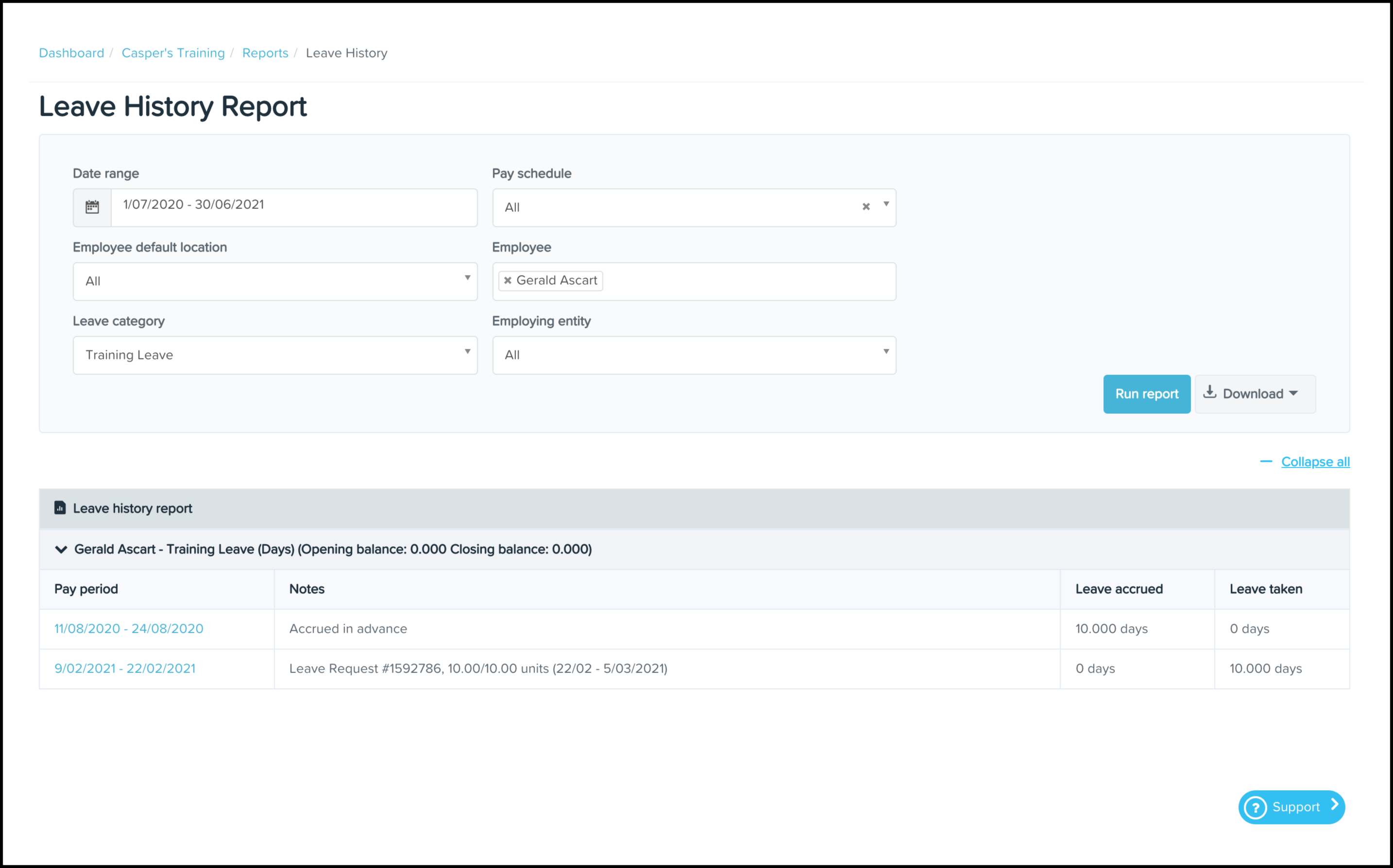The Leave History Reporting feature provides an overview of all leave requests within your organisation, detailing the type of leave, the relevant pay periods, and employees' opening and closing leave balances. You can also download this data as an Excel file or save it in a printable PDF format.