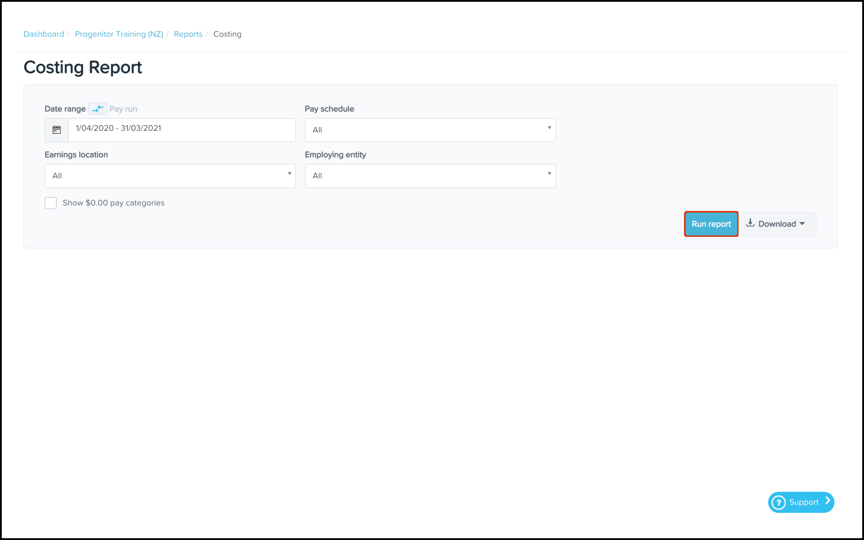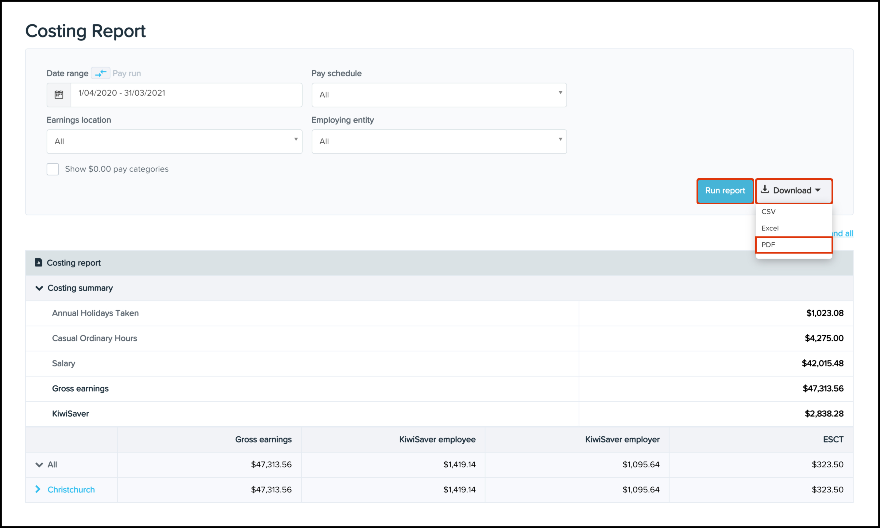 The Costing Reporting feature allows you to create a report that shows your organisation's pay categories broken down by location within a certain date range, with the ability to narrow the data further down by employing entity, pay schedule or earnings location. You can also use this feature to download an excel file of this data or save the information in a printable PDF format.