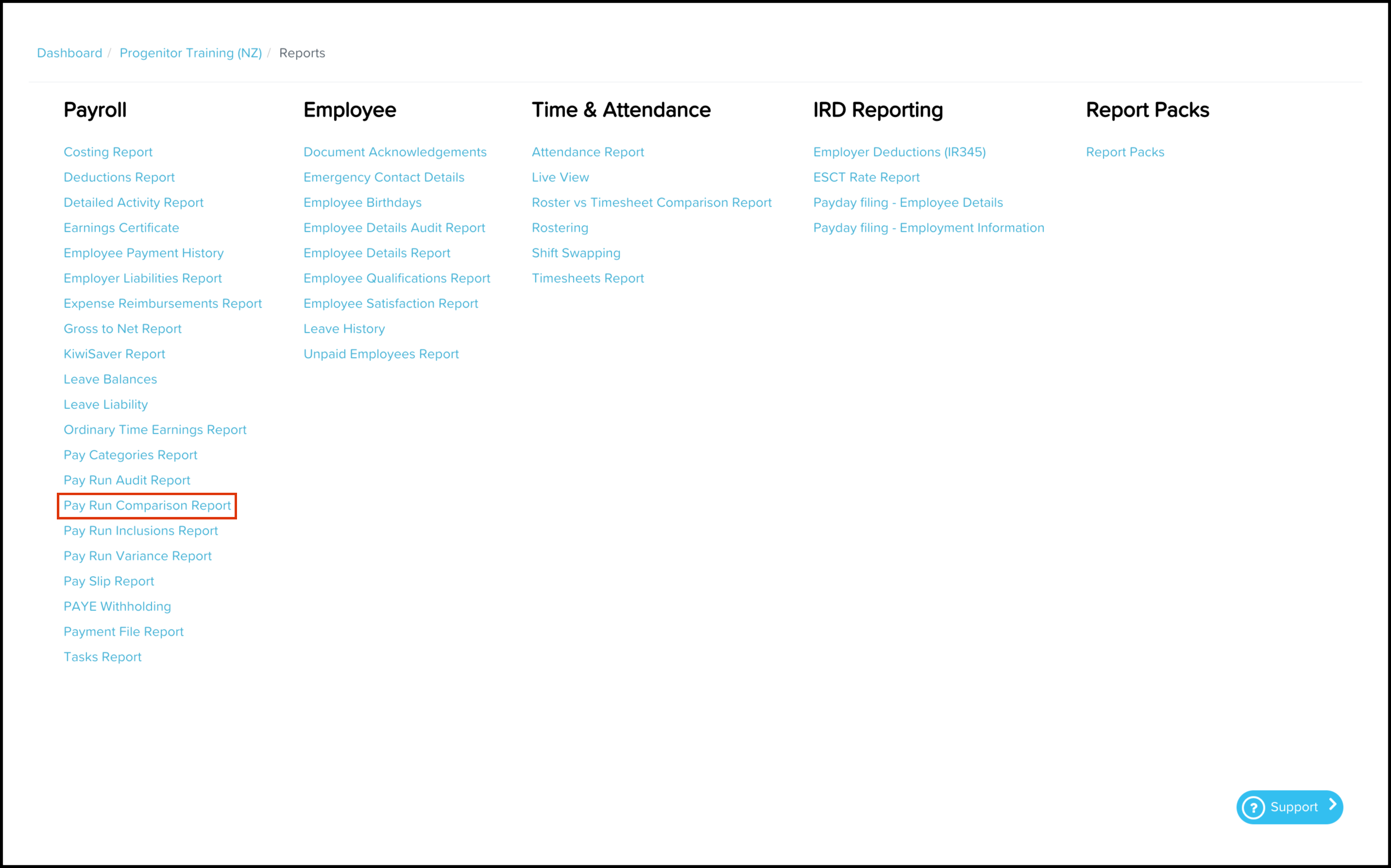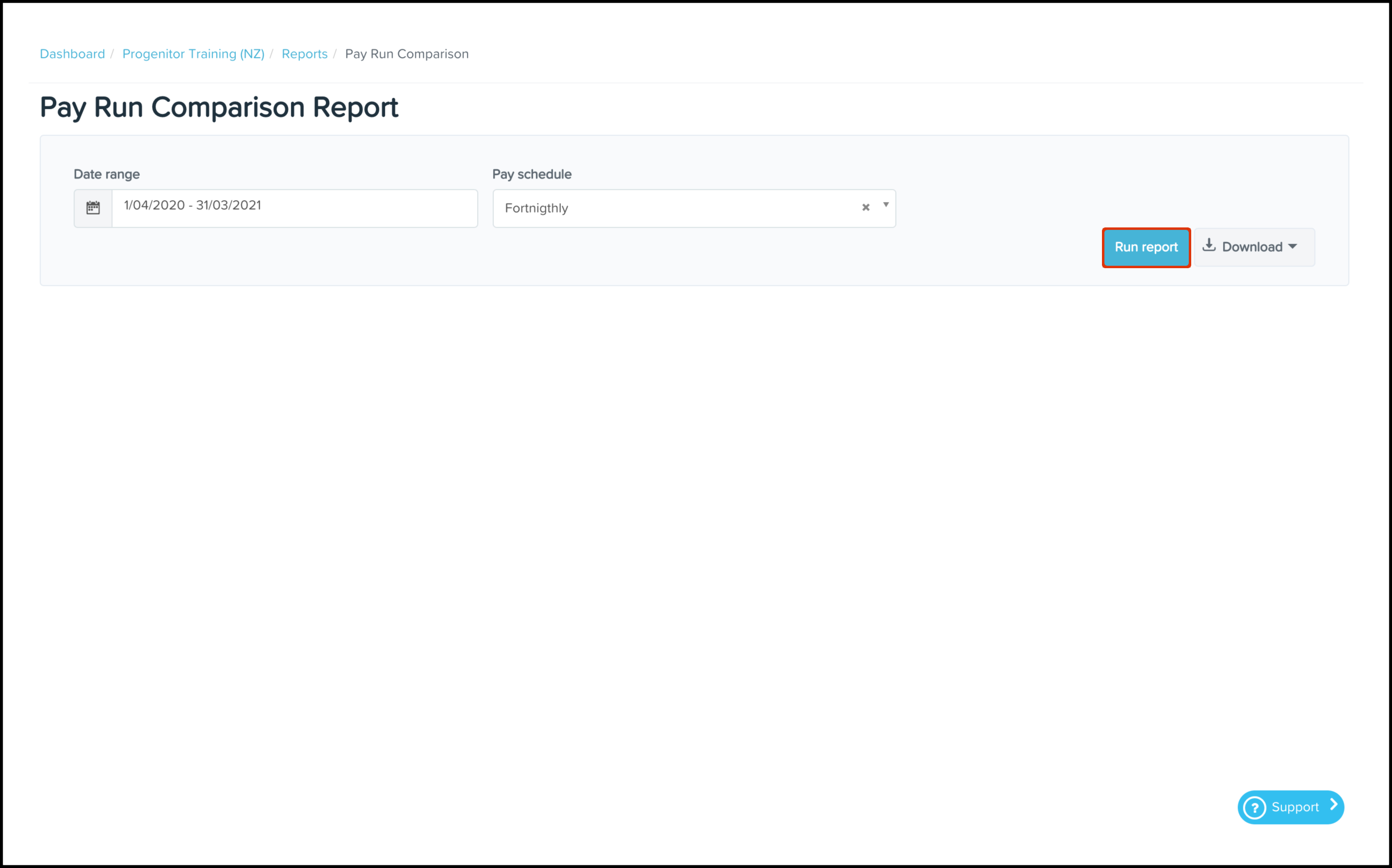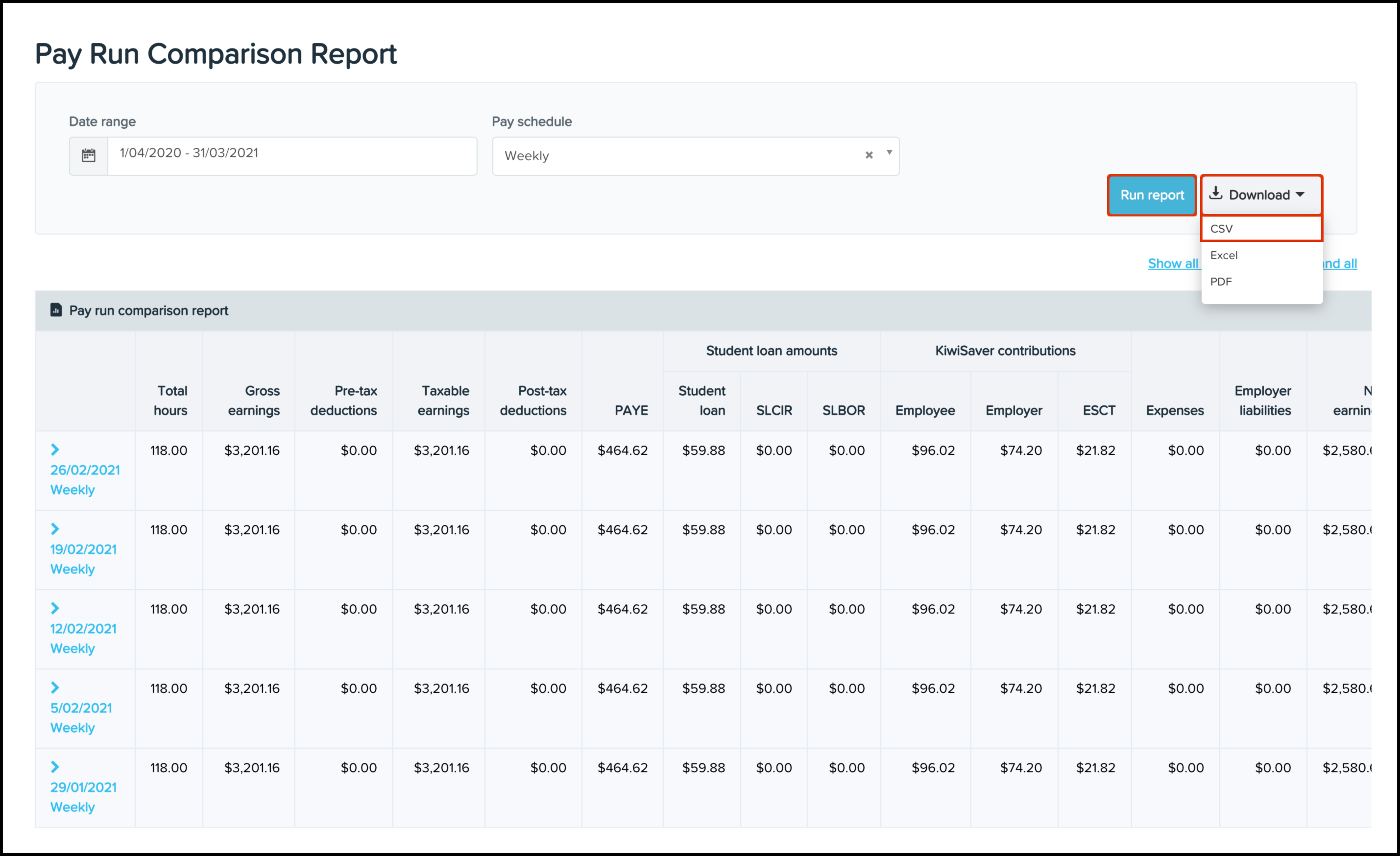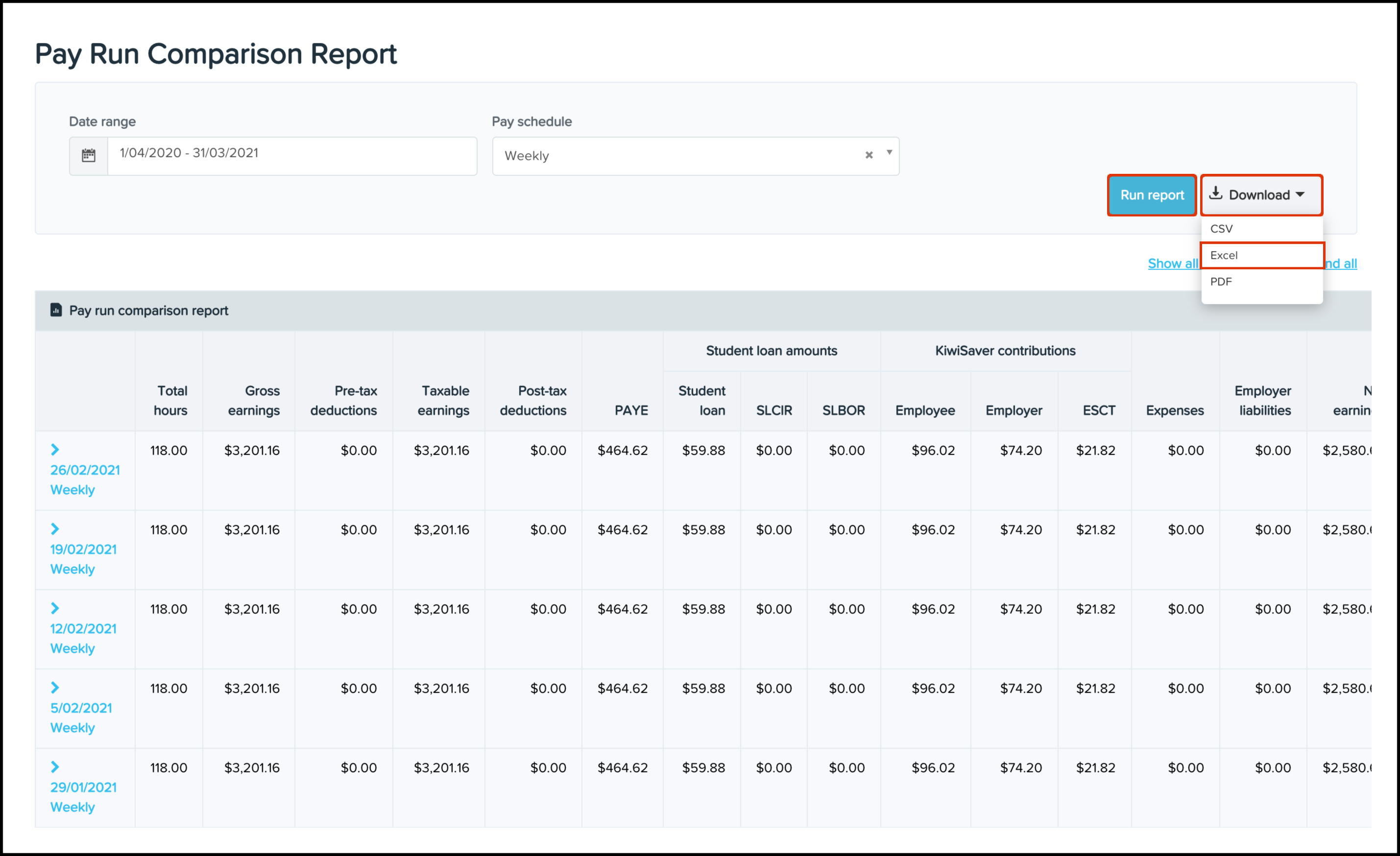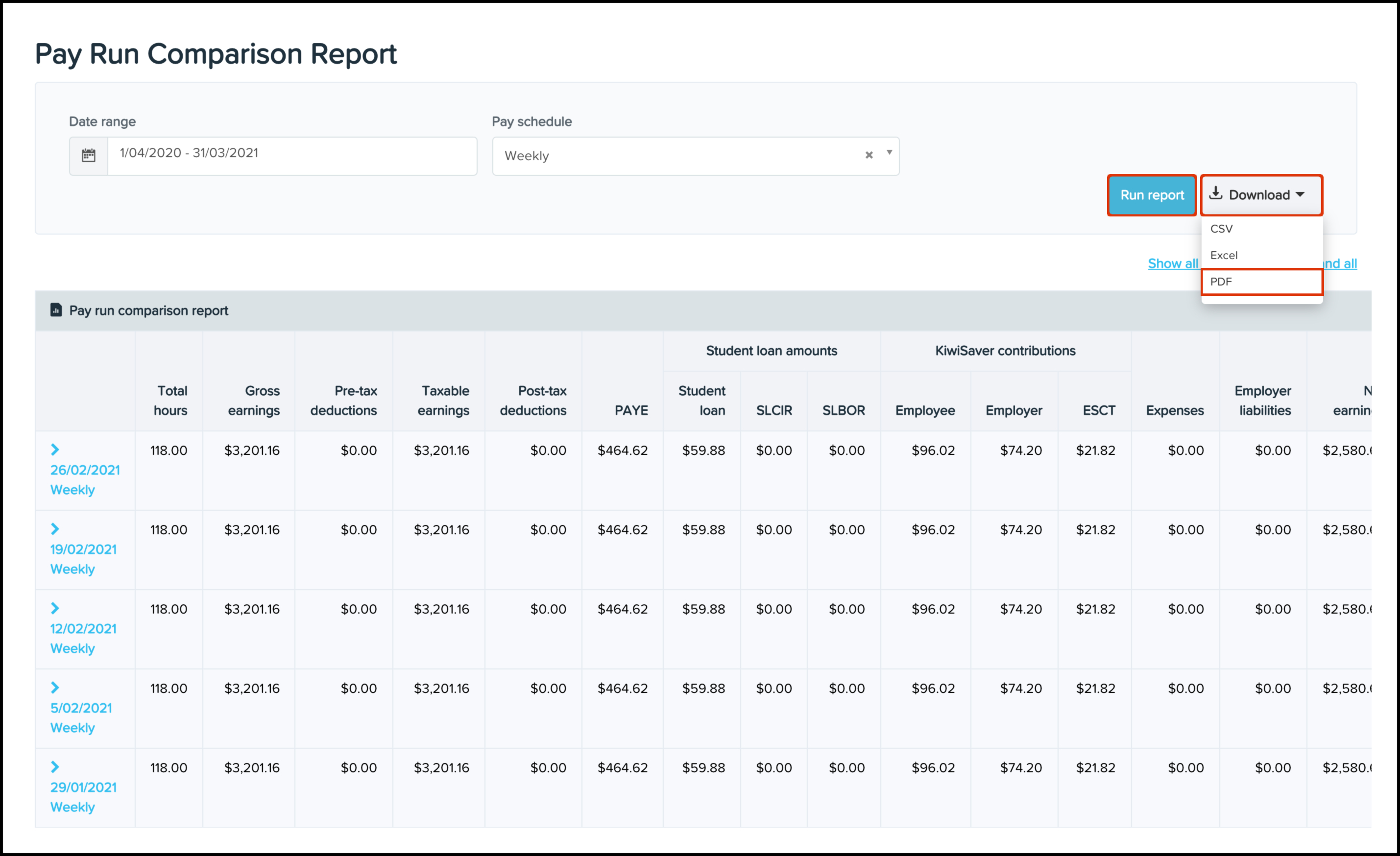 The Pay Run Comparison Reporting feature allows you to compare your organisation's finalised pay runs over a chosen time. You can also use this feature to download an Excel file of this data or save the information in a printable PDF format.